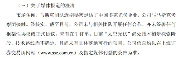 #晶科能源发澄清公告#【#晶科能源否认与马斯克团队合作# 】2月4日晚,晶科能源发布股票交易异常波动公告称,市场传闻,马斯克团队近期秘密走访了中国多家光伏企业,公司与马斯克考察团接触。经核实,截至目前,公司未与相关团队开展任何合作,亦未签署任何框架性协议或正式协议,未有在手订单。 此外,晶科能源表示,公司关注到近期资本市场对“太空光伏”等概念关注度较高,相关板块二级市场表现较为活跃。目前“太空光伏”尚处技术初步探索阶段,产业化进程受技术发展、行业政策、市场环境等多方面因素影响,未来技术应用与产业化落地仍需要一定的时间周期。
