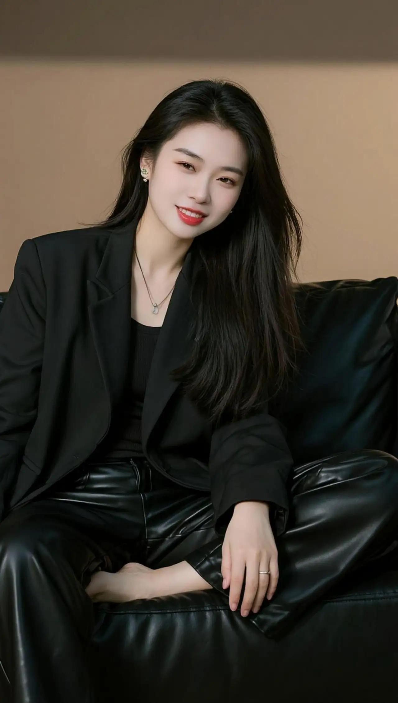 优雅黑色西装搭配黑色皮裤穿搭,自信微笑,魅力无限!😊✨