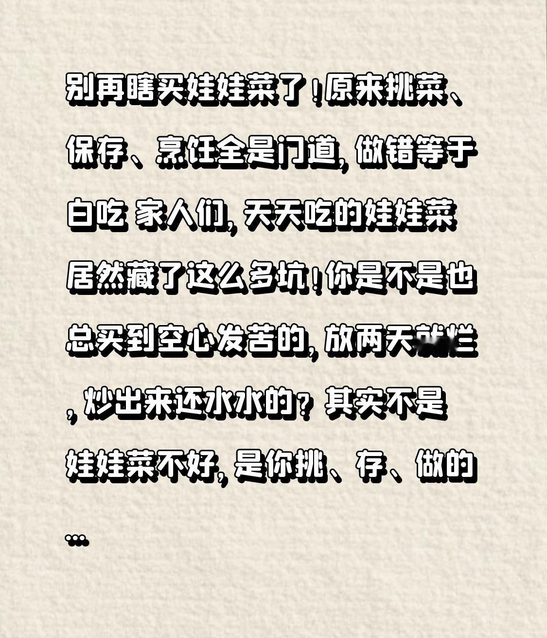 别再瞎买娃娃菜了!原来挑菜、保存、烹饪全是门道,做错等于白吃 家人们,天天吃的娃娃菜居然藏了这么多坑!你是不是也总买到空心发苦的,放两天就烂,炒出来还水水的?其实不是娃娃菜不好,是你挑、存、做的方法全错了,今天这篇干货把门道说透,看完再也不花冤枉钱! 咱先说说挑娃娃菜,这一步最关键,挑错了再怎么做都难吃!很多人买的时候只看颜值,选叶子白白嫩嫩的,殊不知这种大概率是“泡水菜”,看着新鲜,实则水分超标,炒着出水、放着易烂,还没味道。真正的好娃娃菜,得看这3点:首先菜帮要紧实,捏着硬邦邦不发软,空心的直接pass;其次叶片是嫩黄色,不是惨白,叶脉清晰不发黄;最后根部切口新鲜,没有发霉发黑,掂在手里有分量,这才是自然生长的好货。 还有人总把娃娃菜和白菜心搞混,花大价钱买错货!教大家一招快速区分:娃娃菜个头小,一般20厘米左右,菜帮薄且嫩,叶片层层包裹很紧凑;白菜心是大白菜剥出来的,个头偏大,菜帮厚硬,叶片松散,口感差远了,价格还比娃娃菜贵,别再被摊主忽悠了! 挑对了娃娃菜,保存也是个大学问,很多人直接塞冰箱,没几天就蔫吧烂叶,教你两个超实用方法,放半个月都新鲜!短期保存的话,用保鲜膜把娃娃菜紧紧裹住,根部朝下放进冰箱冷藏,隔绝空气和水分,一周内吃都跟刚买的一样;长期保存的话,把娃娃菜切成半颗,用厨房纸擦干表面水分,装进密封袋抽成真空,放进冷冻层,炒的时候直接下锅,口感一点不打折扣,冬天囤菜超合适。 说到烹饪,这就有个大转折点了!很多人炒娃娃菜总做不出饭店的味道,要么水水的,要么炒老发苦,核心就两点:先焯水再炒是误区,猛火快炒才是关键!娃娃菜本身水分多,焯水会让水分更多,炒出来全是汤;正确做法是把娃娃菜掰成小块,洗净后沥干水分,热锅冷油放蒜末、干辣椒爆香,下入娃娃菜开大火快速翻炒,炒到叶片变软、微微断生,加少许盐、生抽和一点点白糖提鲜,全程1分钟左右出锅,脆嫩入味,一点不水,比饭店做的还好吃! 另外教大家一个万能搭配,娃娃菜配粉丝、虾仁一起炒,鲜掉眉毛!粉丝提前用温水泡软,虾仁用料酒和淀粉抓匀腌制,炒娃娃菜时先下虾仁滑熟盛出,再炒娃娃菜,最后放入粉丝和虾仁,加少许蚝油翻炒均匀,简单又美味,老人小孩都爱吃,家常下饭菜直接拿捏。 其实娃娃菜就是咱们日常最朴实的家常菜,便宜又营养,富含维生素和膳食纤维,清肠解腻,不管是清炒、做汤还是涮火锅都合适。看似简单的一颗菜,藏着的却是过日子的小门道,咱们普通人买菜、做饭,不求多贵,只求吃得新鲜、吃得美味,把简单的食材做好,就是最踏实的生活。 生活的美好,从来都藏在这些烟火气的小细节里,挑一颗好娃娃菜,做一顿家常饭,暖胃又暖心。你平时是怎么炒娃娃菜的?有没有独家小妙招?评论区分享出来,大家互相学学,把家常菜做得更美味!