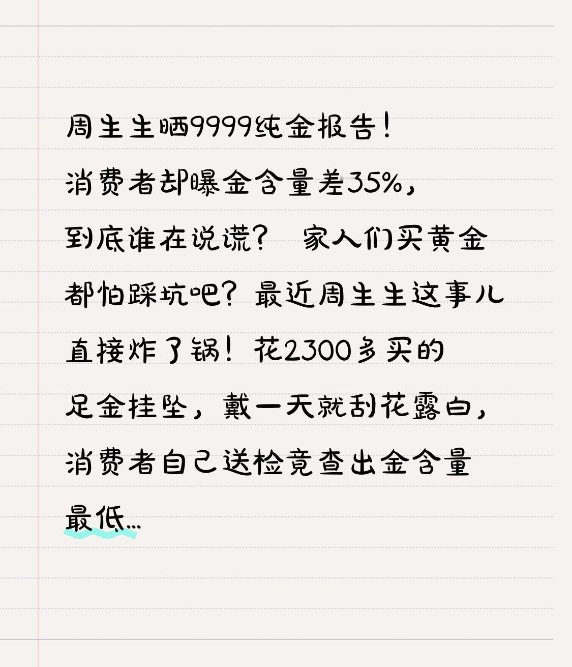 周生生晒9999纯金报告!消费者却曝金含量差35%,到底谁在说谎? 家人们买黄金都怕踩坑吧?最近周生生这事儿直接炸了锅!花2300多买的足金挂坠,戴一天就刮花露白,消费者自己送检竟查出金含量最低才64.37%,还掺了铁、银、钯!可转头周生生就晒出权威报告,说金含量99.99%,这到底是怎么回事? 事情得从广东清远李女士的遭遇说起。1月5号,她在周生生门店入手了一款足金福袋挂坠,花了2306块。结果戴了才一天,挂坠就被刮花,还冒出了白色痕迹,这哪像足金该有的样子?李女士越想越不对劲,赶紧找机构检测,这一测直接吓一跳:挂坠不同点位的金含量差了35个百分点,最高99.99%,最低却只有64.37%,远远没达到国家足金990‰的标准,甚至还检出了铁、银、钯这些杂质金属。 李女士拿着检测报告找门店退货,可对方一开始直接拒绝,说不是质量问题,只同意返厂翻新。这态度彻底激怒了李女士,她直接投诉到12315,事件很快发酵上了热搜。要知道这时候国际金价刚经历大波动,周生生金价单日就降了134元/克,大家本来就对黄金纯度敏感,这事儿一出来,不少买了同批次挂坠的消费者都慌了——这款福袋已经卖了3000多件,难道都是“问题金”? 就在大家以为周生生要耍赖到底时,转折点来了!2月3号晚上,周生生突然晒出重磅检测报告:不仅复核了出厂批次的破坏性检测,还把同批次产品送到国家珠宝玉石首饰检验集团(NGTC)送检,3个检测点结果全是99.99%、99.99%、99.98%,妥妥的足金标准。同时市场监管部门也介入了,经双方同意,涉事挂坠已经送去第三方权威机构重新检测,就等最终结论。 一边是消费者的“掺假检测”,一边是品牌的“纯金报告”,到底谁在说谎?其实关键不在单次检测结果,而在咱们普通人买黄金的顾虑:花大价钱买的“足金”,怎么判断是不是真的?遇到问题商家推诿怎么办?要知道黄金对咱们来说,要么是婚嫁刚需,要么是保值理财,谁也不想花冤枉钱买气受。 不管最后结果如何,周生生这事都给所有黄金品牌提了醒:品控是底线,诚信才是金字招牌。也给咱们消费者划了重点:买黄金一定要选正规渠道,保留好发票标签,遇到质量争议别私下单方检测,直接找监管部门介入,共同委托权威机构鉴定。 你觉得这次是检测误差还是另有隐情?你买黄金遇到过踩坑吗?评论区聊聊你的经历,转发给身边买金的朋友避坑!