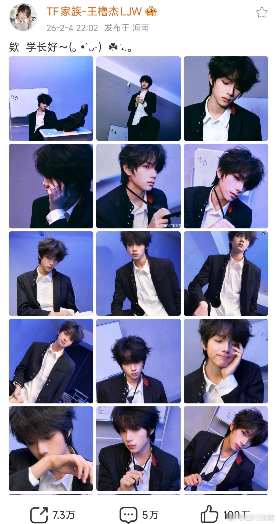 王橹杰 天选顾晨阳 王橹杰微博发了十八宫格的营业,今天是可爱兼帅气的学长,且17分钟点赞即过百万,王橹杰好🔥啊!