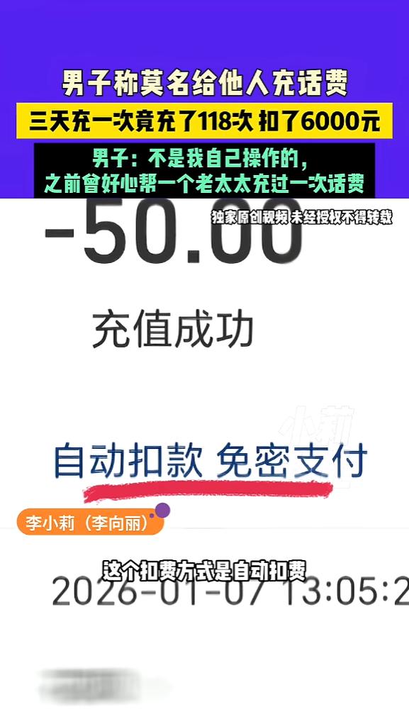 “亏大了!”近日,河南郑州,一男子好心帮一位老太太充值话费,没想到不小心开通了免密支付,在他不知道的情况下,竟每3天就给老太太充50元话费,等到他发现时,已经帮对方充了6000元!这让男子心疼得直跺脚!网友:不能退吗? 事情说起来也简单,就是男子在小区里碰到一位老太太,老太太一脸愁容地说自己手机欠费了,联系不上家人,日子过得也不容易。 男子心善,看着老太太可怜,没多想就主动提出帮她充话费,随手就给老太太充了50块钱,完了就匆匆走了,在他眼里,这就是件举手之劳的小事,过后没多久就忘了。 然而直到有一天,男子查银行卡余额的时候,一下子就懵了——账户里莫名少了6000多块钱。 这笔钱不算小数,男子急得不行,翻来覆去想也想不起来自己花在哪了,最后在家人的帮忙下,一条条核对手机里的交易记录,这才发现了问题所在。 原来自从上次帮老太太充完话费之后,他的支付账户竟然被开通了免密自动充值服务,每隔三天就会自动给老太太的手机号充50块钱,一来二去,连续扣了一百多次,累计下来刚好是6000块。 男子说,他根本不记得自己授权过这个服务,全程都不知情,要是早发现,也不至于亏这么多。 后来男子又查了一下,发现那位老太太每个月的话费竟然有四百多块,远远超出了普通老人的正常使用范围。 他试着给老太太打电话沟通,想问问情况,可电话要么没人接,要么刚接通就被挂断,到最后也没联系上对方,这让他心里更不是滋味,甚至怀疑自己的善意被人利用了。 网友们看到这事,议论声特别大,最关心的还是那6000块能不能退回来。 其实这事没那么简单,男子一开始帮着充的50块,是自愿赠与的,没什么可说的,但后续这一百多次自动扣款,是在他不知情的情况下发生的,就有点说道了。 按道理说,平台开通免密支付这种涉及用户资金安全的服务,得明明白白提醒用户,还得经过用户确认才行,不能偷偷开通。 男子这种情况,大概率是上次充值的时候,不小心点到了什么隐蔽的勾选框,而平台又没有明显提醒,才导致他不知情开通了免密服务。 至于这钱能不能追回来,不好说,一方面可以联系支付平台和运营商,说明情况,提供相关的交易记录,申请核查并退款,毕竟是未经本人明确授权的扣款,平台多少得负点责任。 另一方面,老太太那边,要是确实不知情,或许会配合返还;但要是明知话费来源异常,还故意不接电话、放任消费,那就算是不当得利,男子也可以通过法律途径试着追回损失。 这事也给大家提了个醒,现在免密支付的坑太多了,平时不管是充话费、买东西,还是开通什么服务,点确认之前一定要多看两眼,别随便勾选不认识的选项,避免不小心开通免密服务,造成不必要的损失。 另外,平时也得多查查自己的银行卡和支付账户账单,发现不明扣款及时处理,别等亏大了才后悔。 对此您有什么不同的看法,可以在评论区留言讨论!!! 信息来源:《男子称莫名给他人充话费,三天充一次竟充了118次扣了6000元,男子:不是我自己操作的,之前曾好心帮一个老太太充过一次话费》河南广播电视台民生频道