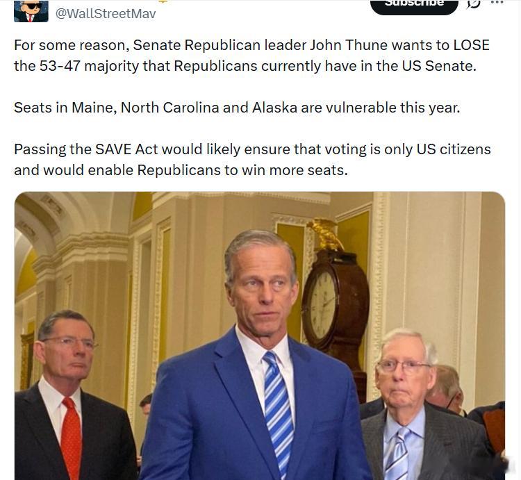 参议院共和党领袖约翰·图恩似乎想要丢掉共和党目前在美国参议院拥有的53比47的多数席位。