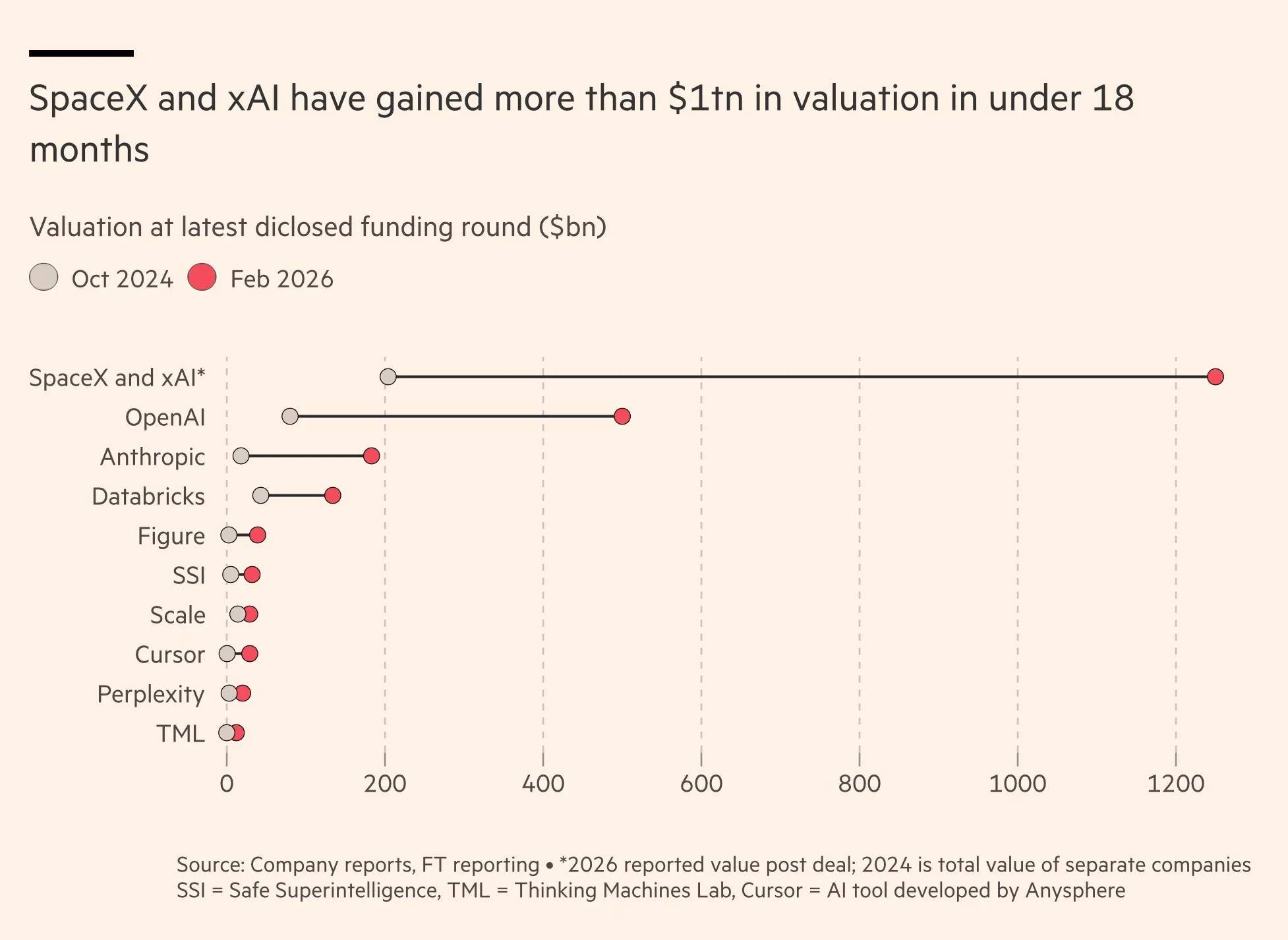 马斯克拍板,把火箭公司 SpaceX 和亏损中的 AI 新创 xAI,以及社群平台 X 整合在一起,打造出估值高达 1.25 兆美元的私人企业,成为史上最贵的未上市公司。他对外宣称,这次整并是为了把数据中心送上太空、在月球盖工厂、替火星殖民铺路,支持者认为这是把可回收火箭、星链卫星网络、X 的数据流与 AI 模型整合的战略级布局。批评者则直指,这更像一场高强度的财务操作,用 SpaceX 的高估值,去撑住每月烧掉约 10 亿美元现金的 xAI,整体估值并没有建立在传统财务倍数基础上,而是高度依赖马斯克个人光环与市场信仰。交易过程也相当仓促。SpaceX 以约 2500 亿美元价格收购 xAI,接近后者最新一轮募资估值,xAI 股份按约七比一换成新公司股票,同时 SpaceX 内部估值被上调到 1 兆美元,理由是星链订阅与火箭发射收入大增。在不到 18 个月内,马斯克体系的 SpaceX 加上 xAI,合计估值从大约两千亿美元等级,一路跳到超过 1.2 兆美元,单一组合就贡献了超过一兆美元的估值增量,直接把其他热门 AI 公司甩在后面。合并后公司仍计划在 6 月推动 IPO,市场估计募资规模上看 500 亿美元,可能刷新史上最大上市案纪录,时点上也被解读为要抢在 OpenAI 与 Anthropic 之前进入公开市场。