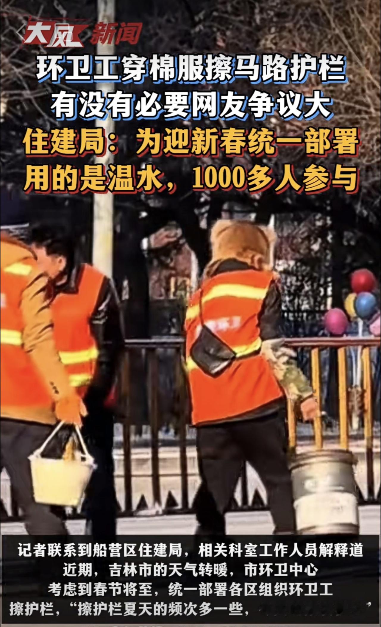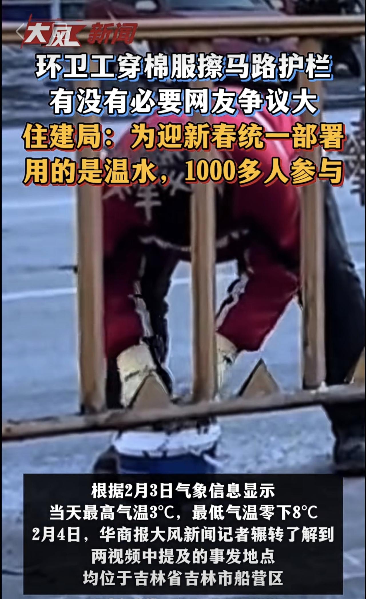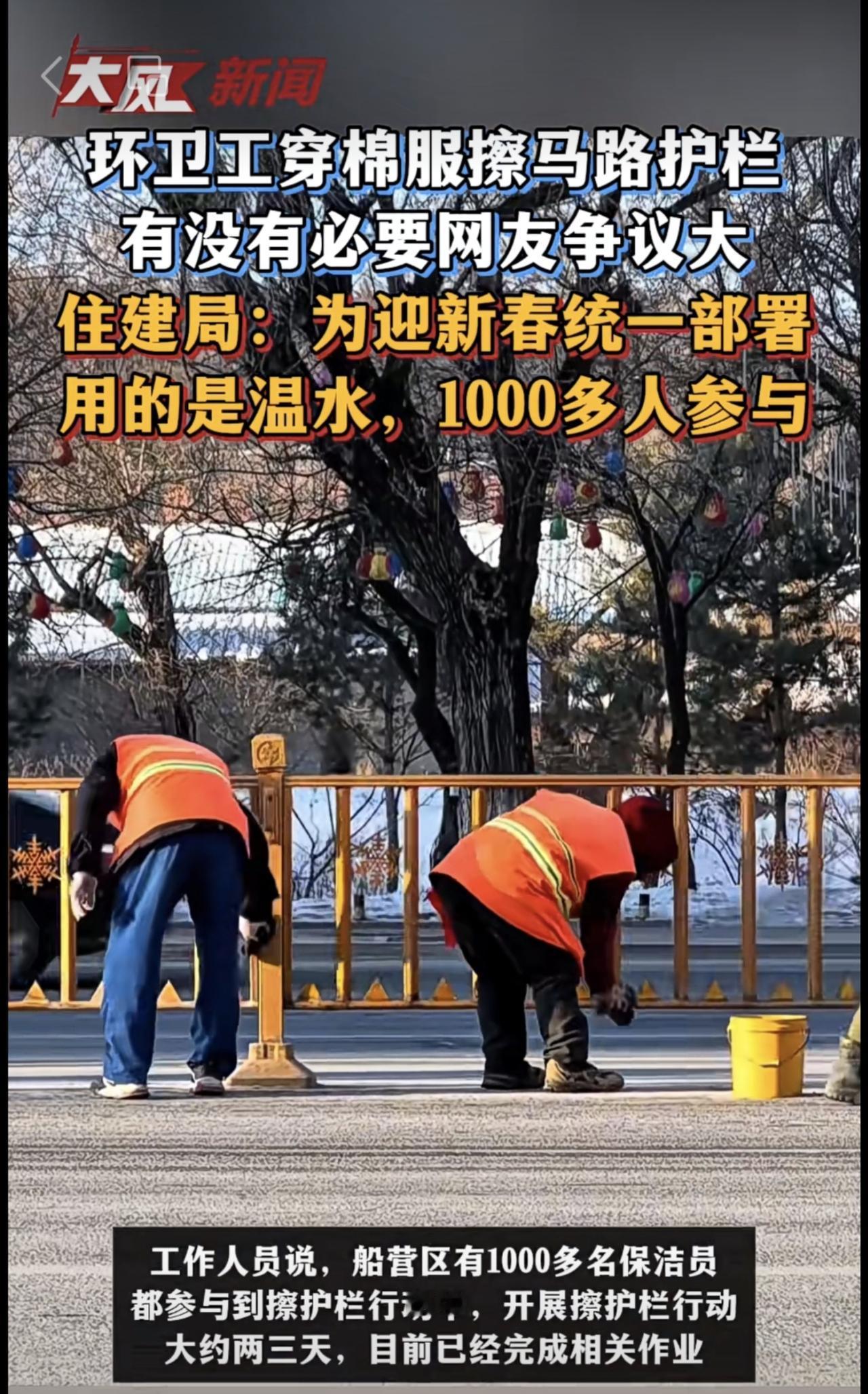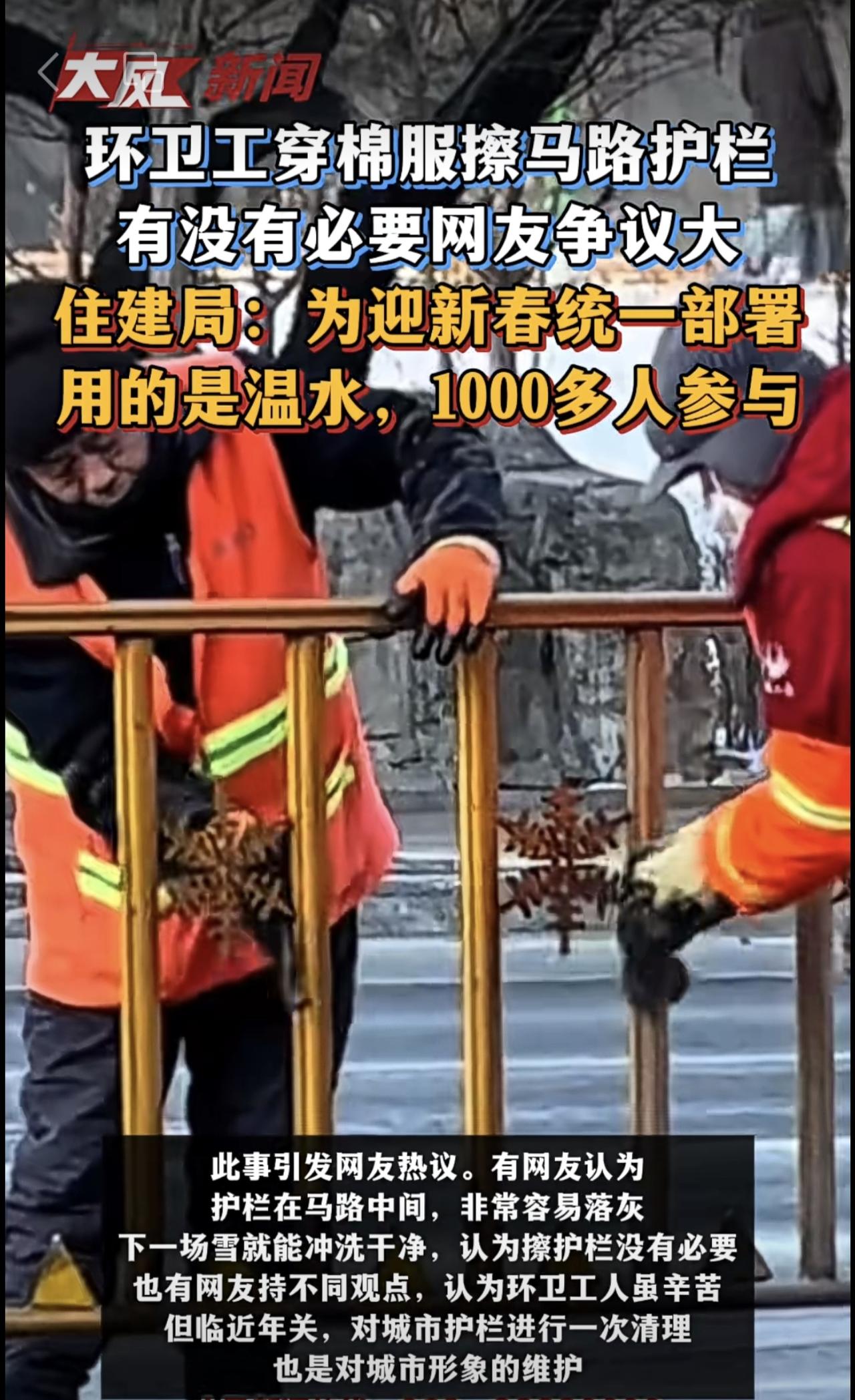 环卫工穿棉服擦马路护栏,有没有必要网友争议大;住建局:为迎新春统一部署,用的是温水,1000多人参与。