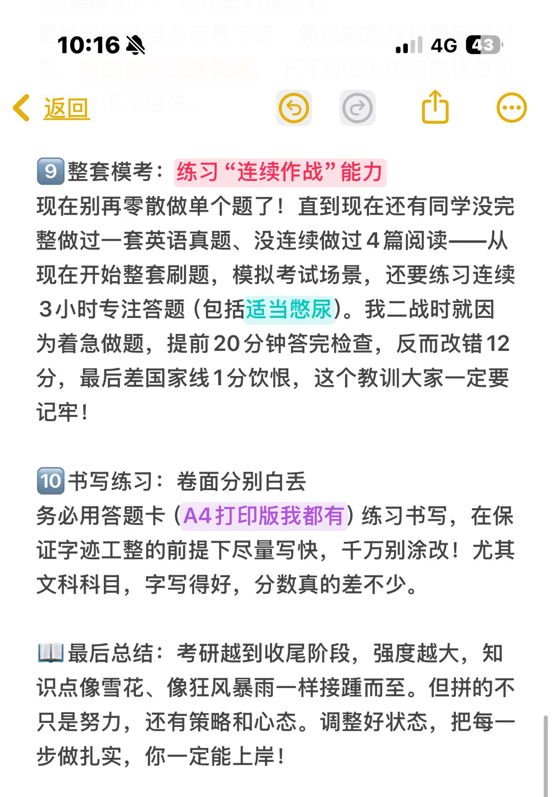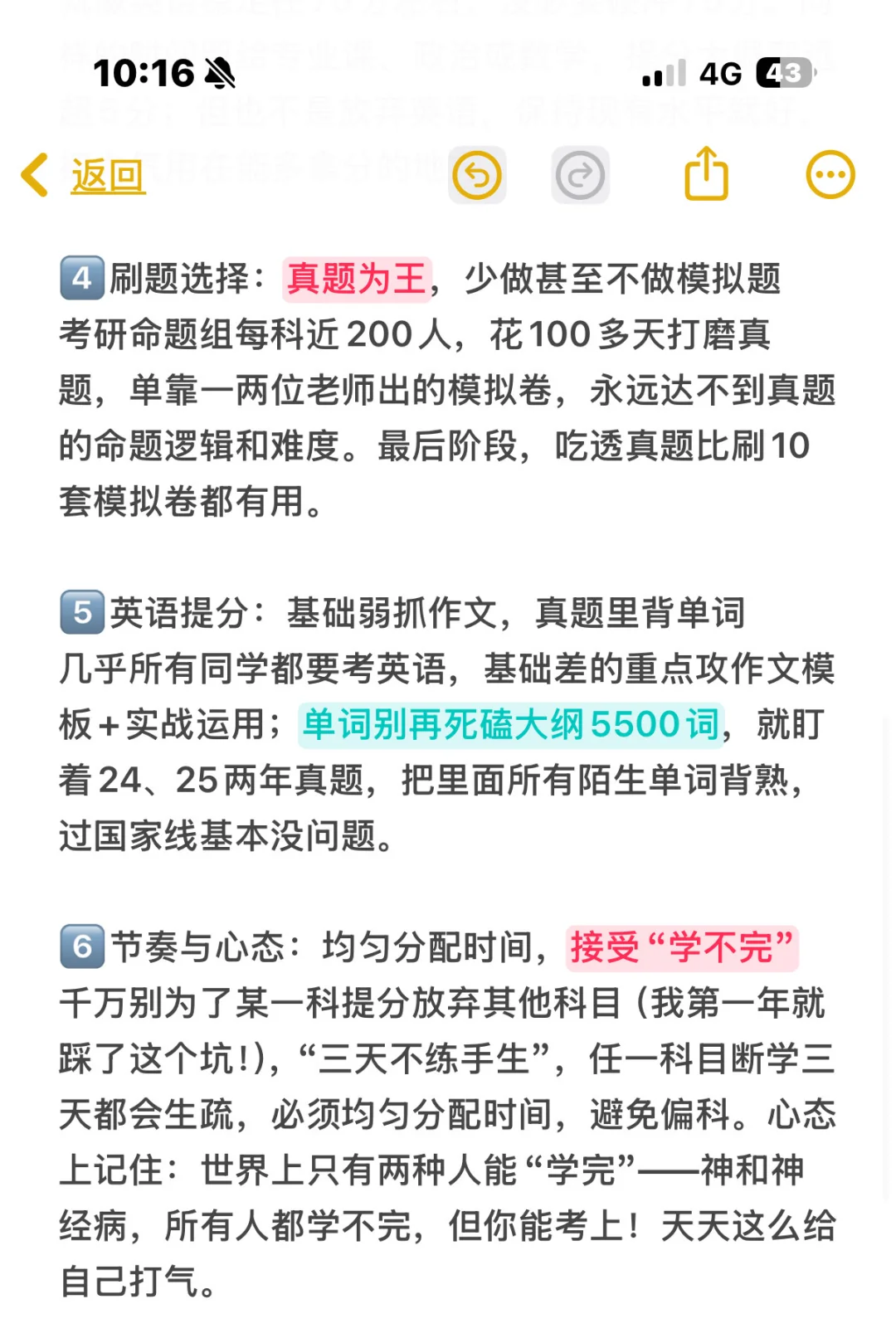 最后一个多月无需熬夜死磕,“每天学到3点”不如10小时高效专注。别用时长自我感动,最终结果才是核心,摸鱼式12小时、15小时远不及高效10小时管用