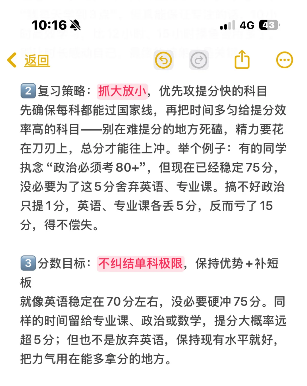 先确保每科过国家线,再把时间倾斜给提分效率高的科目,别在难提分的地方死磕。比如政治稳定75分,没必要执念80+,若为5分舍弃英语、专业课,可能导致政治仅提1分,其他科目各丢5分,反而亏15分,得不偿失