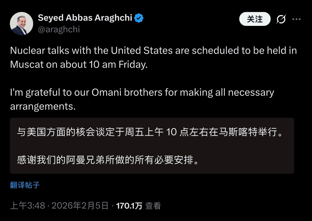 🔻伊朗外长阿拉格齐当地时间2月4日晚通过社交媒体表示,伊朗与美国的核问题会谈定于当地时间2月6日上午10点(北京时间下午2点)左右,在阿曼首都马斯喀特举行。🔻阿拉格齐对阿曼为此次会谈所做的一切必要安排表示感谢。🔻稍早一点时间,美国国务卿鲁比奥公开表示,他支持与伊朗人会面,但坚持认为无法达成任何协议。🔻这基本上将谈判定性为象征性的。🔻美国人目的可能是争取时间、完成准备工作,并为可能的战争建立合法性基础。🔻据报道,随着支持美军中东地区行动节奏的加快,位于德国的斯潘达勒姆空军基地已转为全天候运行状态(图3,ACARS)。海外新鲜事热点现场伊朗称失联无人机曾传回图片