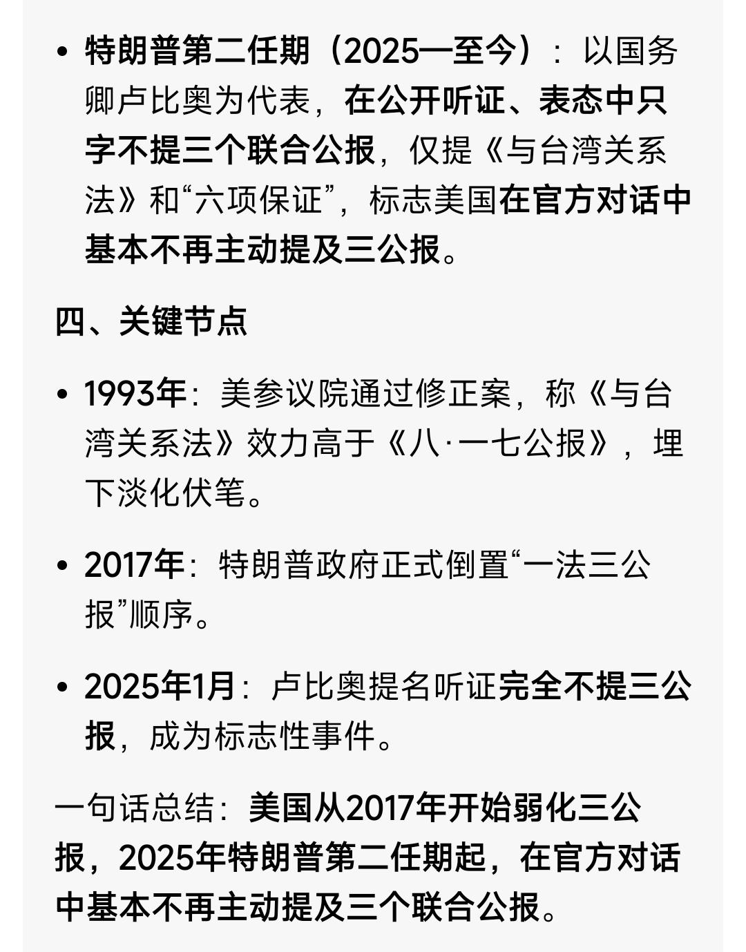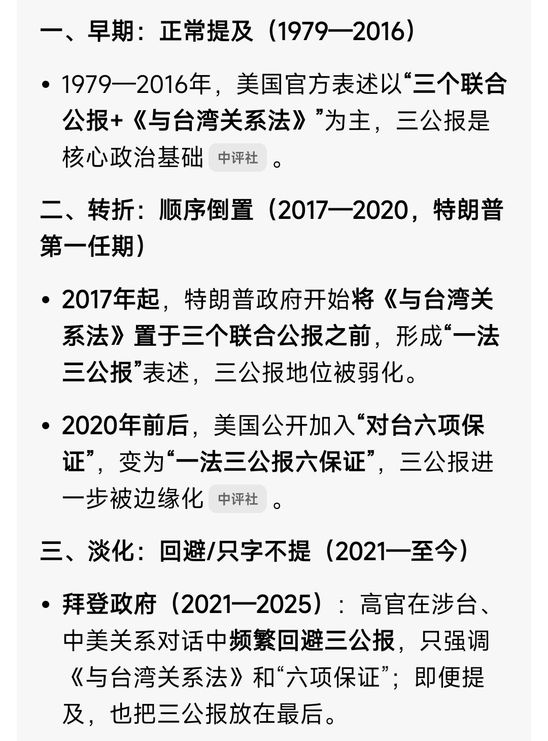 不查不知道,一查吓一跳! 特朗普刚刚在通话中表示,重视我们在台湾问题上的关切,愿同我们保持沟通,在他任内保持与我们关系保持良好稳定。 原来美方常在表态中加上一句,坚持中美三个联合公报。而特朗普在近几次对台湾问题表态时,似乎都没有提及。 带着好奇,问了问豆包。这一查才发现,原来特朗普不提这句话,是故意的。 特朗普、拜登等罔顾历史,对美国签订的重要文件刻意回避,不断在台海挑动是非,只会搬起石头砸自己的脚。 我们这次已经明确警告特朗普,务必慎重处理对台军售问题。如果他还揣着明白装糊涂,就有他好看的。