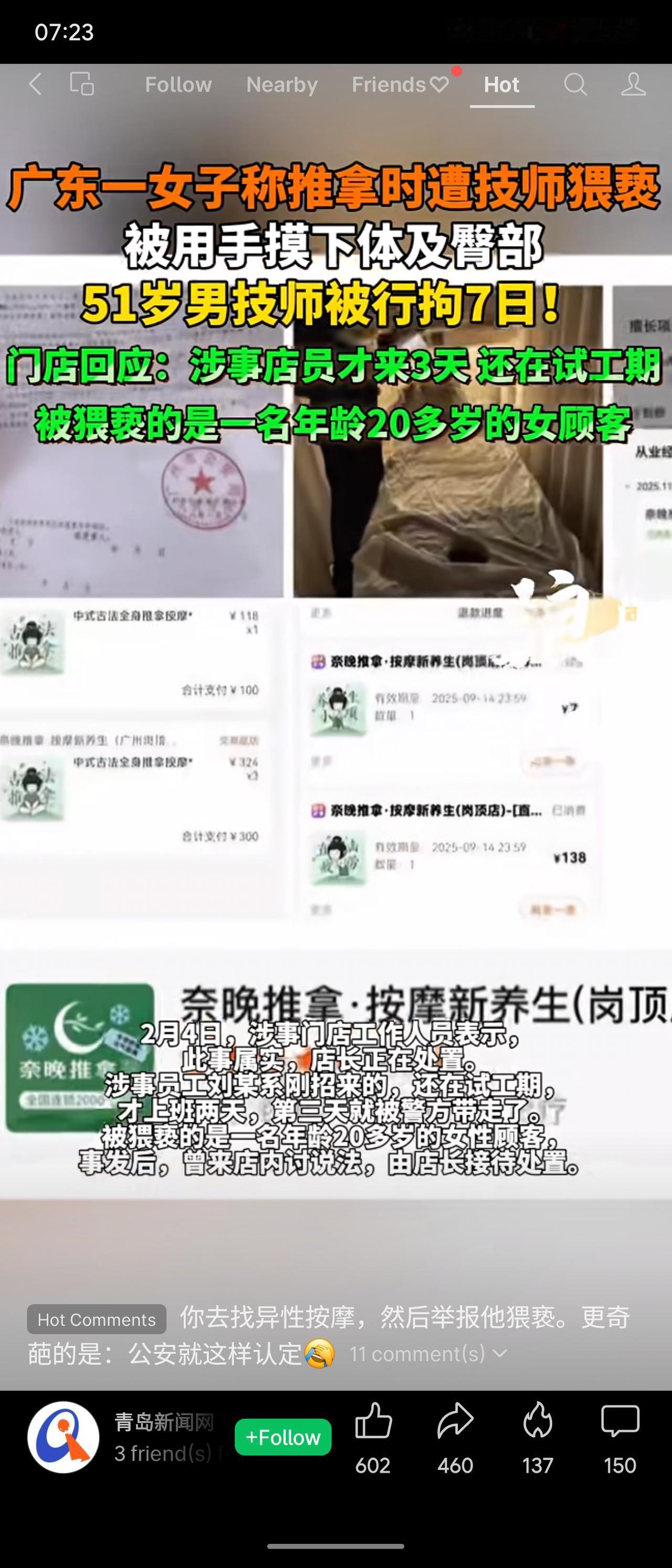 近日,广东一名20多岁女子在“奈晚推拿·按摩新养生”门店消费时,遭51岁男技师刘某用手触摸下体及臀部。经查,刘某曾在2023年因猥亵被行拘,此次再犯被公安机关当场抓获,处以行政拘留7日。涉事门店回应称该员工刚入职3天,尚在试工期。
