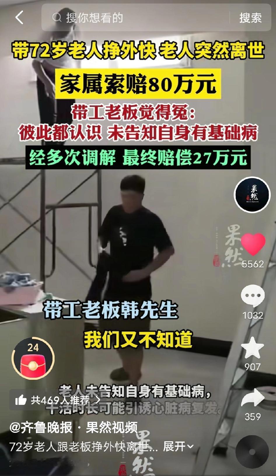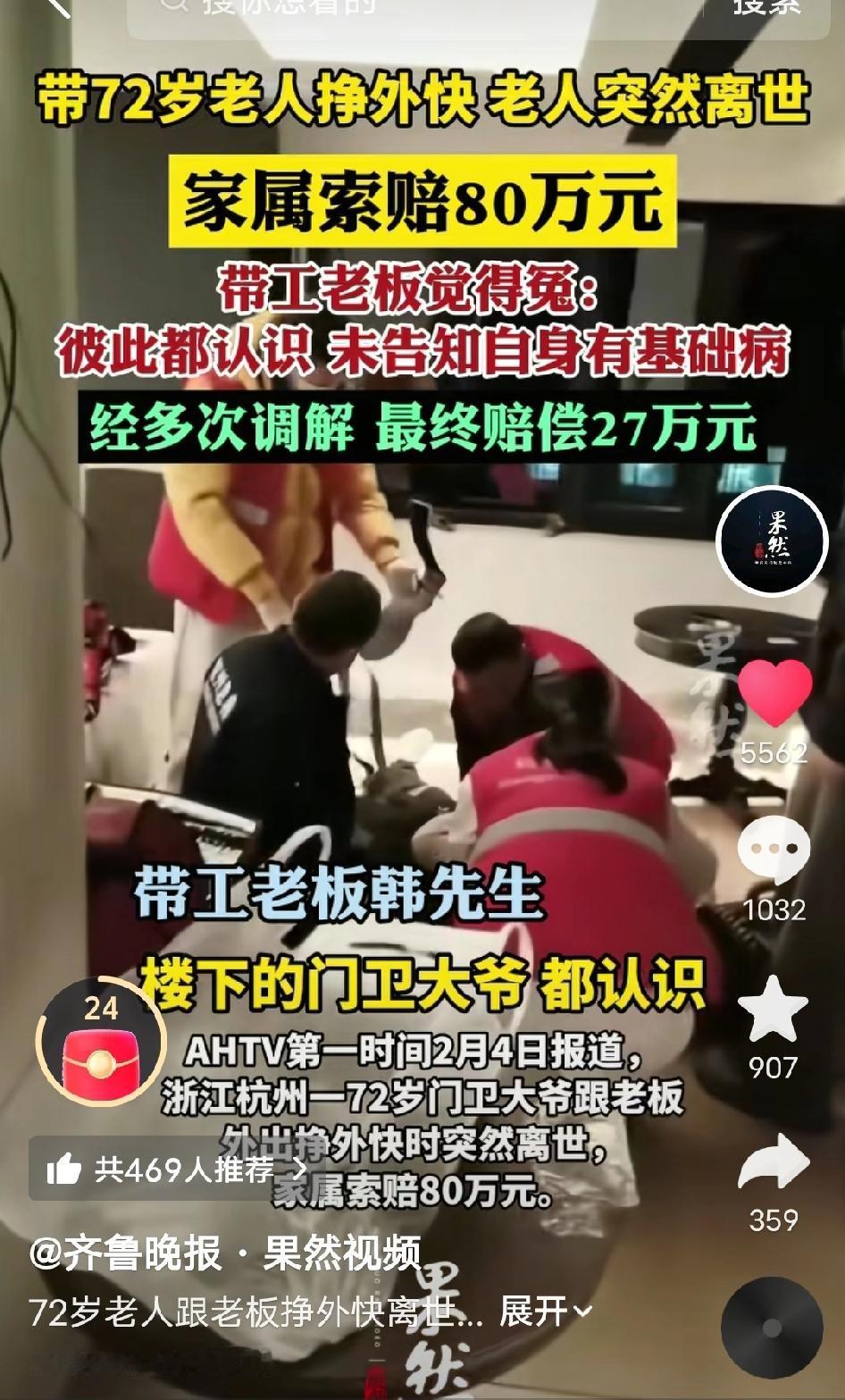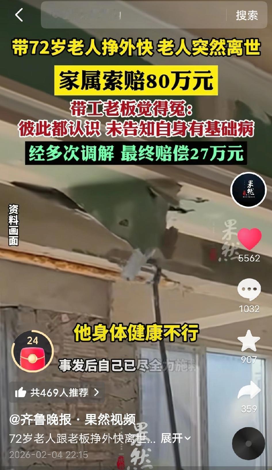 太揪心! 好心老板带72岁门卫大爷打零工,老人工作中却突然倒地离世,家属竟张口索赔80万!老板委屈:我只是带他做轻活,还全力施救了,却要背锅买单? 浙江杭州,2月4日,一场本是好心帮衬的“打零工”,最终却酿成了阴阳两隔的悲剧,还牵扯出80万到27万的索赔拉锯,让人心酸又无奈。 72岁的门卫大爷,是公司楼下的老熟人,平时和带工老板韩先生关系不错。大爷年纪大了,想多挣点零花钱补贴家用,韩先生看着老人身体硬朗,又实在,便时常带他出去做点轻活——大多是递递工具、打下手,比如安装窗帘这类没强度的杂活,从不是重体力劳动,算是一份轻松的“人情活”。 事发当天,韩先生像往常一样,带着大爷从湖州赶往杭州,做窗帘安装的零工。全程都是轻体力活,没让老人累着,可谁也没料到,工作刚结束,意外突然降临——大爷毫无征兆地一头栽倒在地,脸色瞬间惨白,呼吸也变得急促。 韩先生当场吓懵了,顾不上收拾东西,立刻冲上前,一边大声呼喊大爷,一边掐人中、做心肺复苏,拼尽全力施救,还第一时间拨打了120。可即便抢救及时,大爷还是没能挺过来,最终不幸离世,一条鲜活的生命就此定格。 本是好心帮老人增收,却落得这般结局,韩先生心里又愧疚又难受。可更让他措手不及的是,老人家属得知消息后,直接向他提出了80万元的索赔要求,一口咬定是韩先生带老人干活、劳累过度导致猝死,老板必须负全责。 面对80万的索赔,韩先生满肚子委屈,他坦言,自己和大爷是熟识后的帮衬,并非正式雇佣,干的都是轻活,从未让老人过度劳累;而且大爷从未跟他提过自己有心脏病、高血压等基础病史,他推测,大概率是当天往返湖州、杭州,工作时间稍长,诱发了老人的基础病复发。更重要的是,老人倒地后,他第一时间全力施救,该做的都做了,尽到了最大责任。 一边是家属痛失亲人,要求高额赔偿;一边是老板好心帮衬,却莫名背锅,委屈不已。双方各执一词,互不相让,经过多轮协商、调解,反复拉扯后,最终才达成一致:韩先生向老人家属赔偿27万元,此事才算暂时告一段落。 网友评论区瞬间吵翻了,观点两极分化,各有各的理: 有人心疼老板:“好心没好报!本来就是帮老人打轻零工,又不是重活,谁能想到有基础病?还全力施救了,赔27万已经够仁义了!” 有人理解家属:“毕竟人没了,72岁还出去打工,家属心里肯定痛,索赔也是情理之中,只是80万确实太高了。” 有人理性分析:“一个没说病史,一个没问清楚,双方都有疏忽。但老板带工,确实有一定责任,27万算是折中了。” 还有人感慨:“打零工的风险太大了,尤其是老人,没合同没保险,一出事全是扯皮,太难了!” 我见过太多类似的事情,最讽刺的是,很多悲剧的源头,往往是一句“都是熟人,不用那么麻烦”。 这件事里,没有绝对的对错,却藏着打零工群体最现实的心酸与风险。 韩先生的初衷是好的,帮老人找点轻活增收,事发后也全力施救,尽到了道义责任;但他忽略了最关键的一点——没有提前询问老人的健康状况,也没有签订任何用工协议,一旦出事,就只能被动承担责任。 而家属痛失亲人,提出索赔可以理解,但80万的高额要求,显然超出了合理范围,最终27万的调解结果,算是双方各退一步的折中方案。 这起事件也给所有打零工的老人、带工老板敲响了警钟: 无论是帮工还是雇佣,健康告知、责任约定、安全保障缺一不可。老人打工,务必如实告知基础病史;老板带工,也务必提前核实健康状况,避免因疏忽酿成悲剧,最后落得人财两空、满心委屈。 这个事情大家怎么看呢? 杭州 门卫猝死 打零工索赔