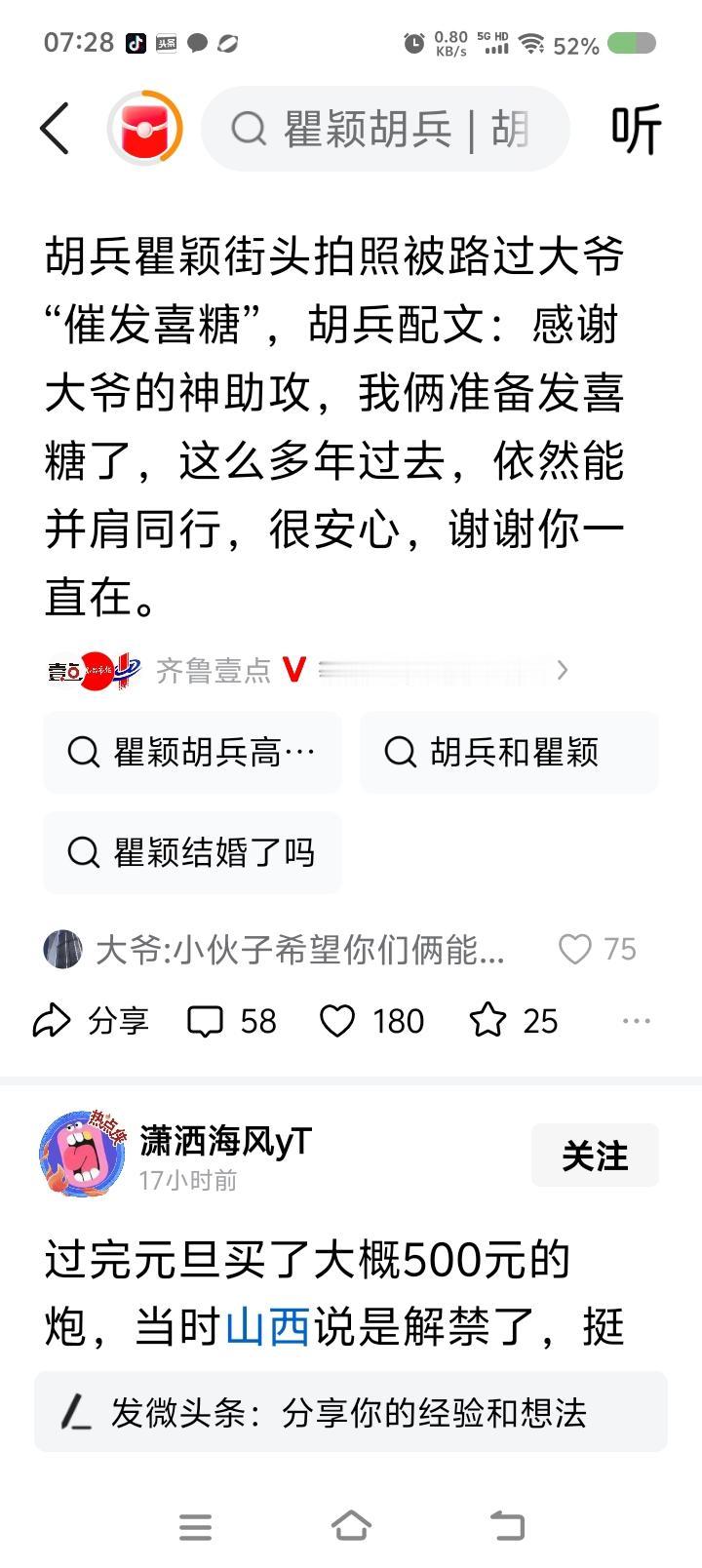 大爷为胡兵操碎了心—— 据报道,胡兵、瞿颖街头拍工作照,路边大爷问:“拍完了不发喜糖?”瞿颖笑了。胡兵发文:“感谢大爷助攻,我俩准备发喜糖了……谢谢你,一直在。” 点评: 大爷头发都等白了,为二人操碎了心。 两人应该拍一部电影,叫《城门》。内容我想好了。导演找贾樟柯。
