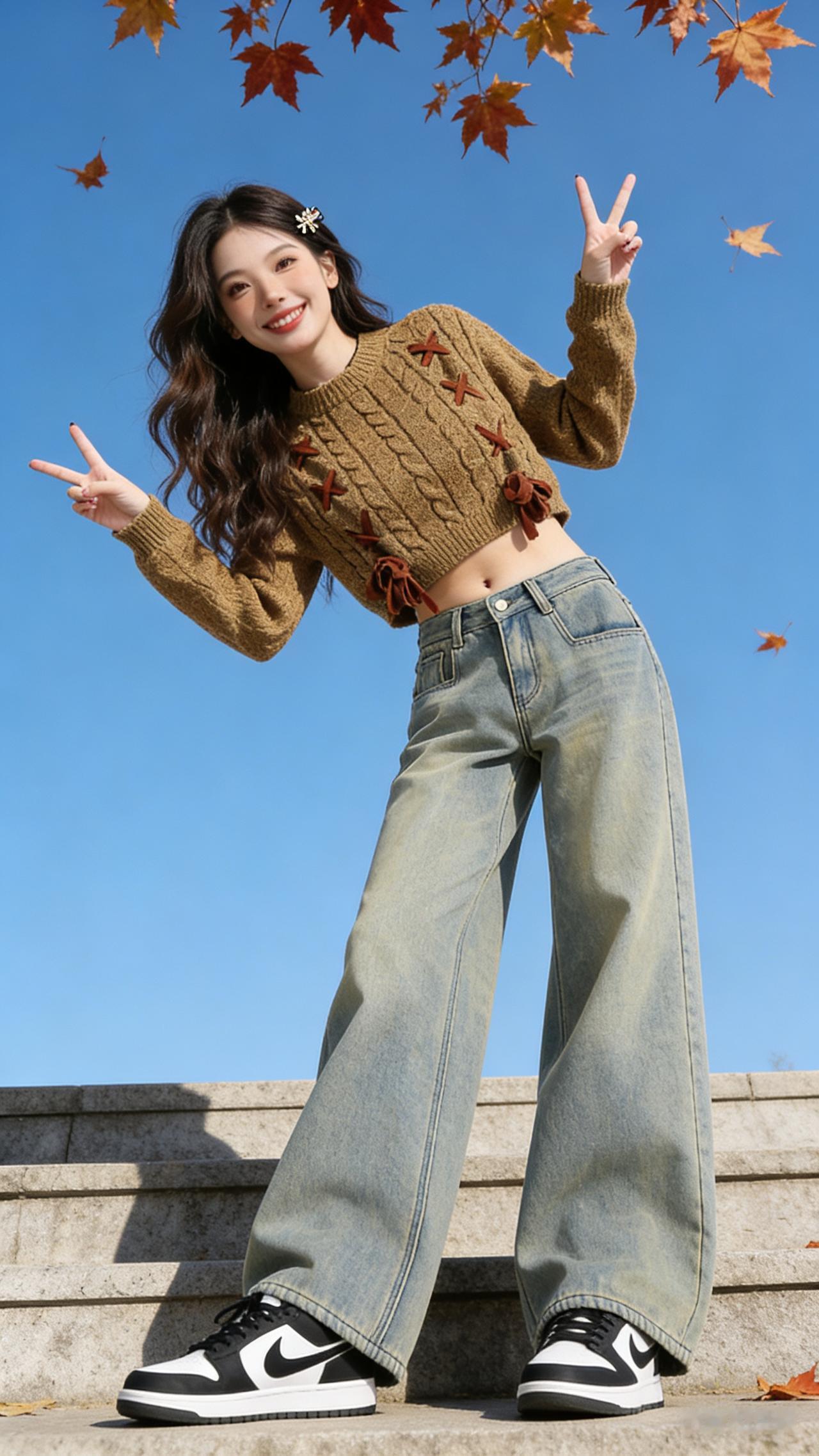 一个女孩在台阶上摆出V字手势,笑容灿烂。