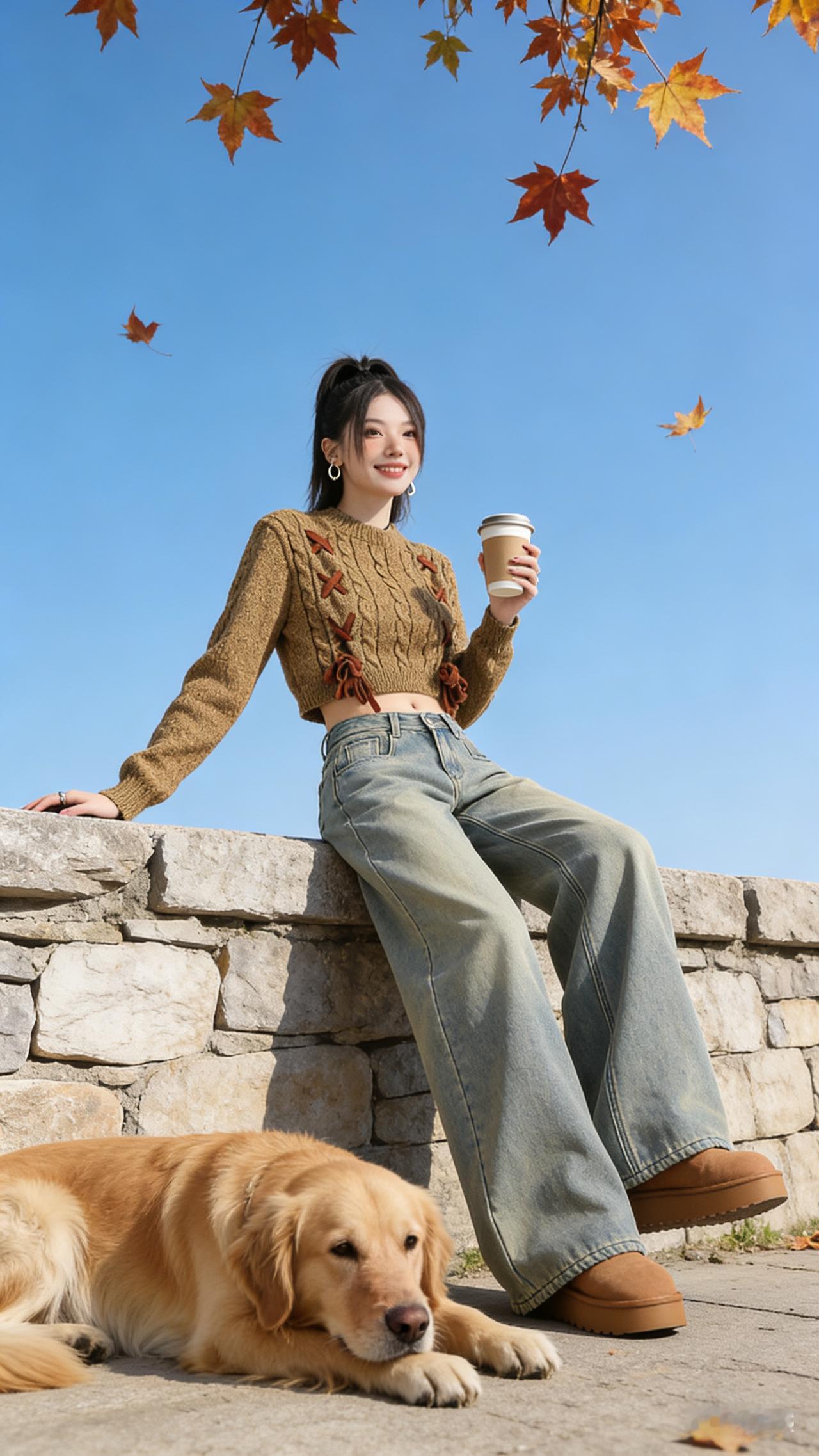 在落叶中,她靠在一辆豪车前微笑。微笑美女 知性微笑动景