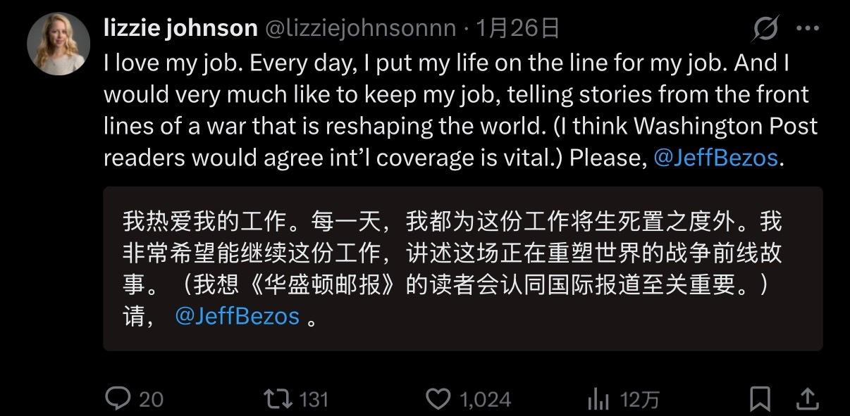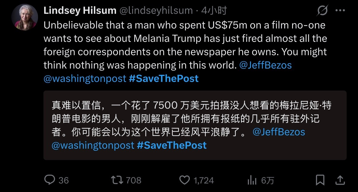 🔻所以,这些美国媒体人,你们到底是自豪还是心寒?🔻尽管这些美国驻乌克兰、伊朗等地的记者一直在网上隔空喊话,但是它们还是被裁掉了。🔻华盛顿邮报据称裁员了近1/3,国际部基本被砍完了”,因为贝索斯想盈利。🔻有美国人说:“真难以置信,一个花了 7500 万美元拍摄没人想看的梅拉尼娅·特朗普电影的男人,刚刚解雇了他所拥有报纸的几乎所有驻外记者。你可能会以为这个世界已经风平浪静了”。🔻乐。🔻你们也有今天?🔻图9更乐,大家一定要看图9。热点现场海外新鲜事 特朗普政府为何急于将爱泼斯坦案翻篇