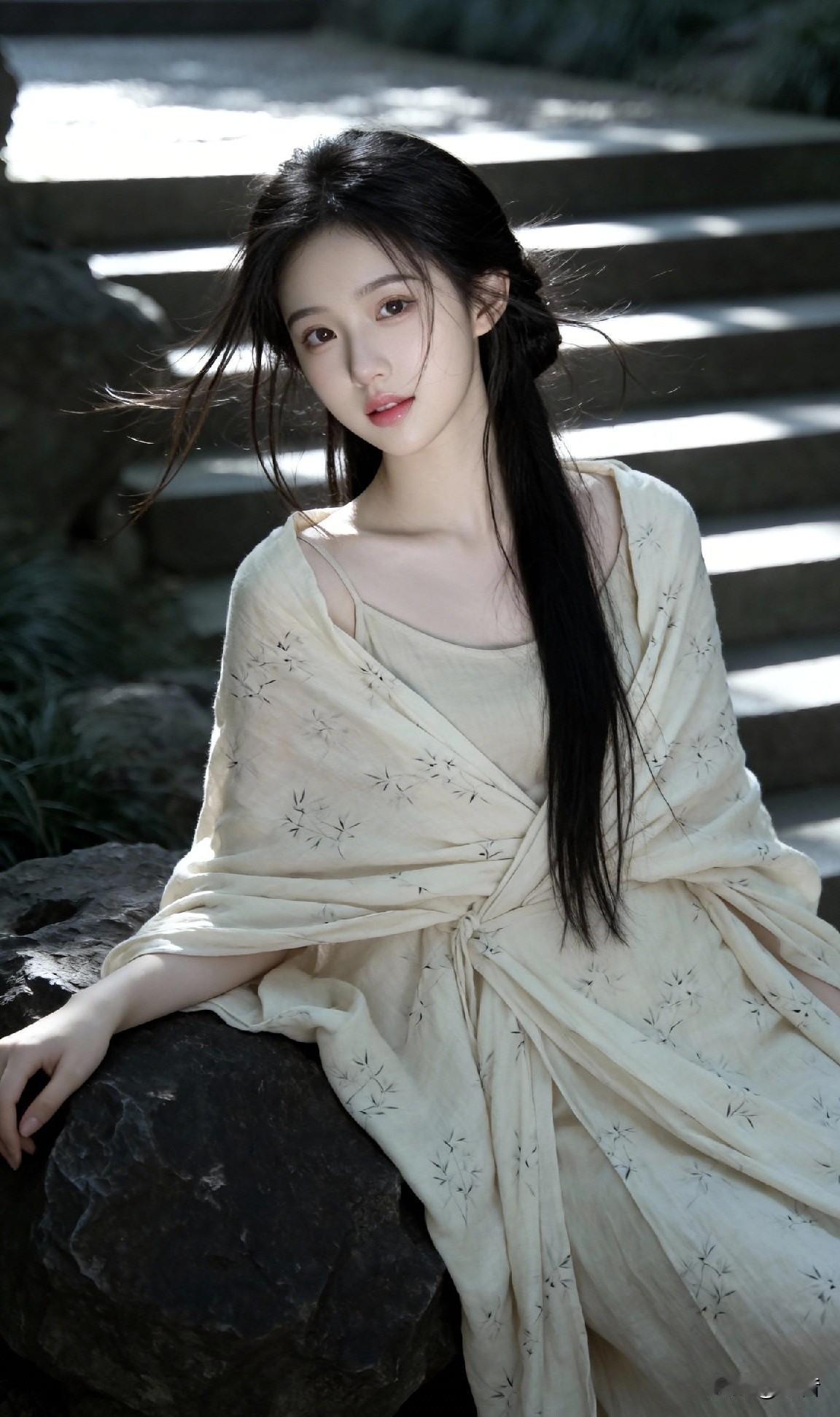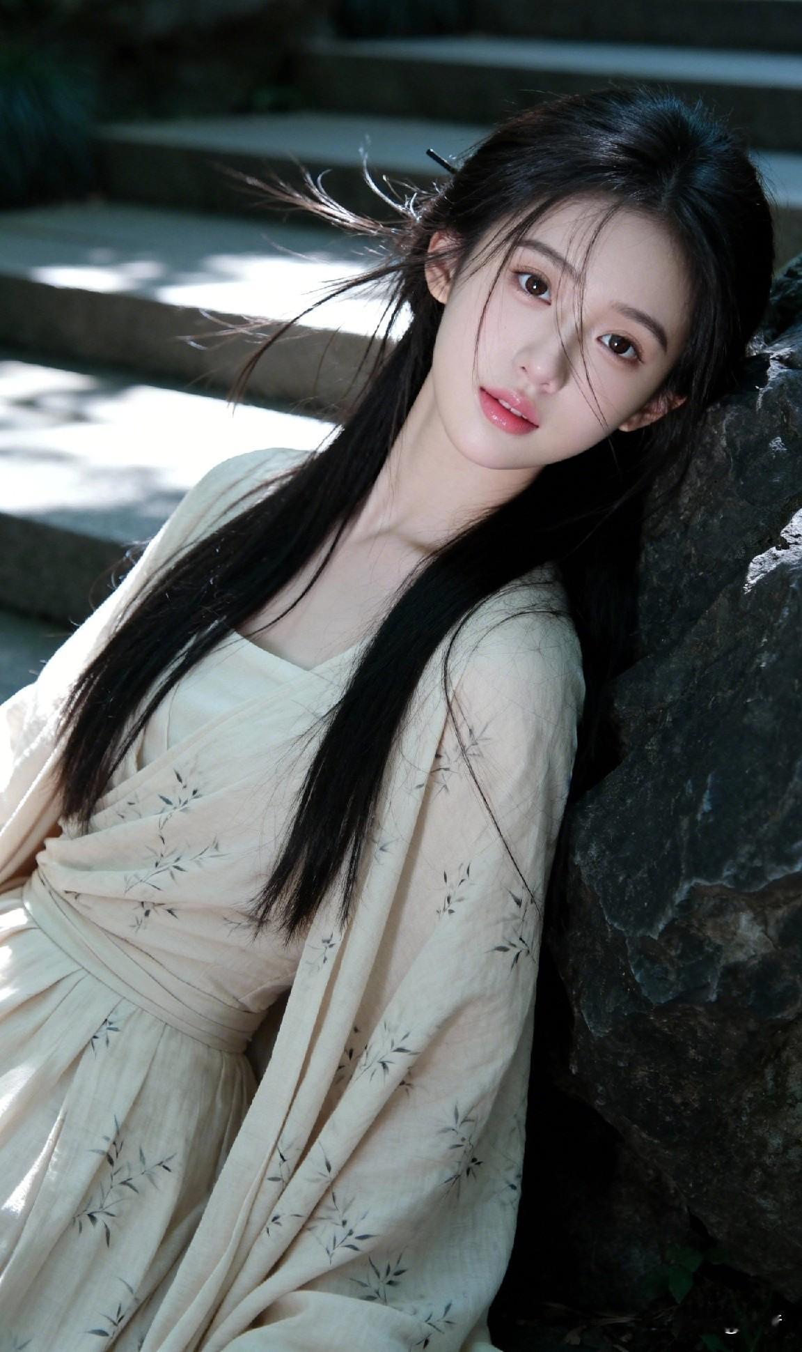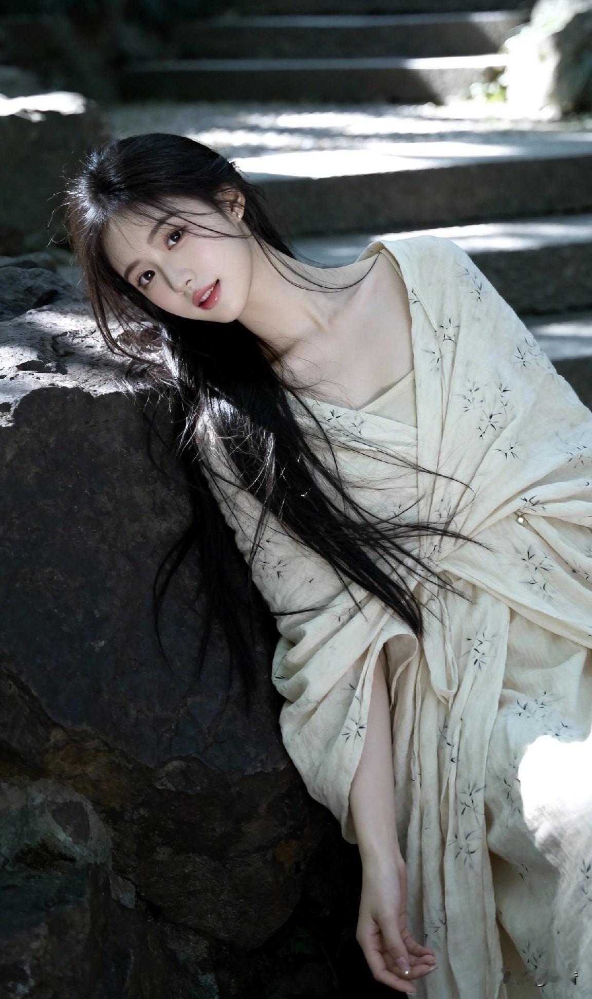 一袭素衣倚旧岩 分明是画中仙 偏又沾着人间的甜