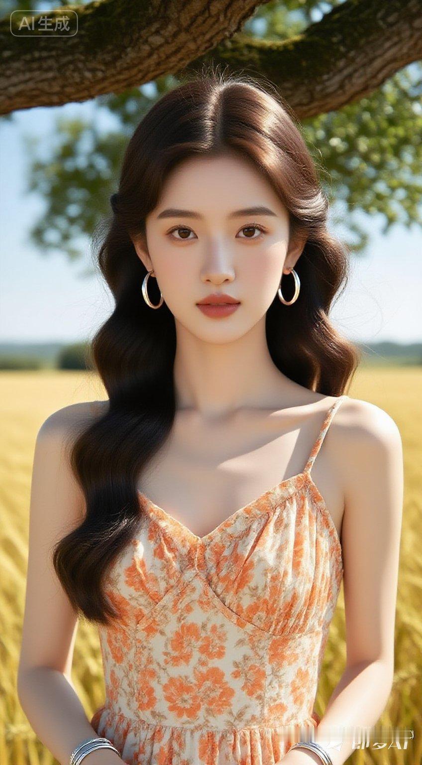 一位20多岁的东亚气质美女,深棕色长卷发自然垂落,妆容精致清透(裸色系口红+自然