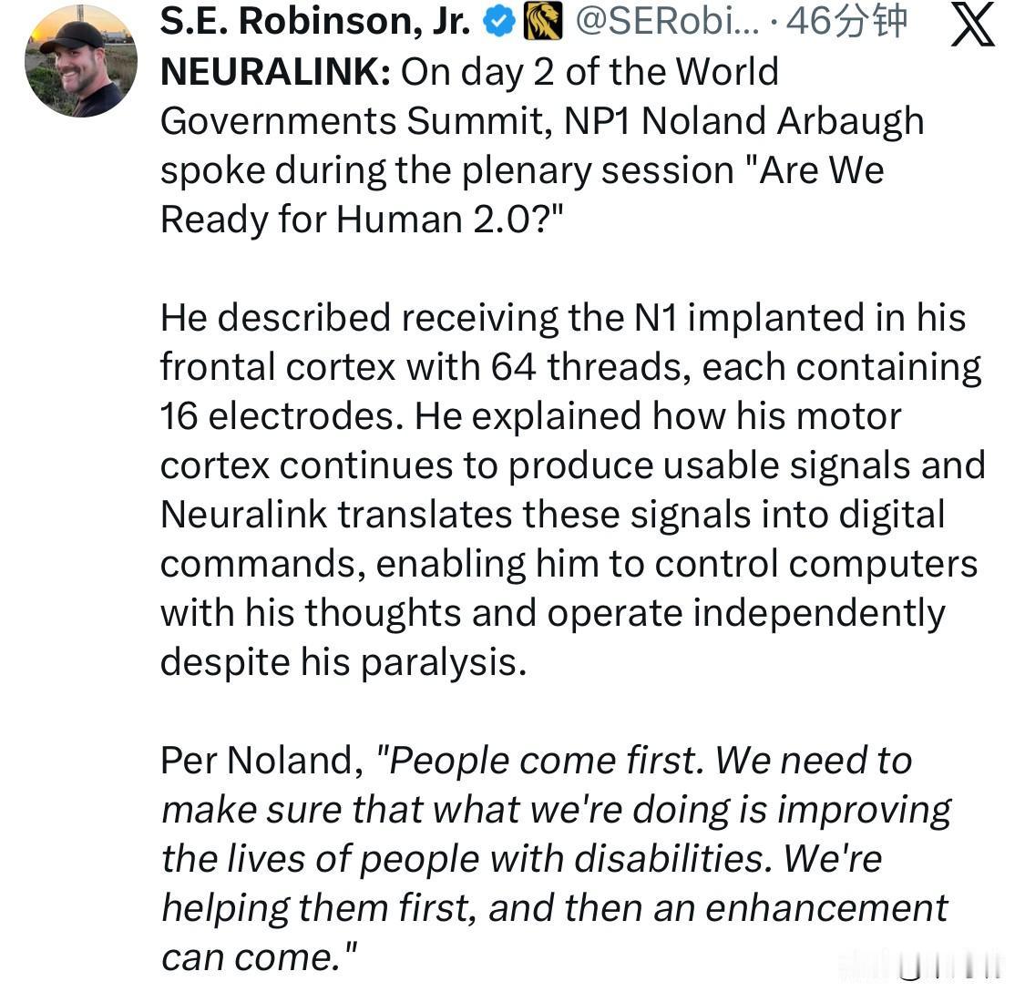 在 2026 年2月4日于迪拜举行的世界政府峰会(World Government Summit 2026)上,Neuralink 的首位人类受试者 诺兰·阿博(Noland Arbaugh )发表了备受瞩目的演讲。 演讲核心内容与技术细节 人类 2.0 的愿景: 诺兰·阿博在全体会议上探讨了脑机接口(BCI)是否会重新定义人类。他认为该技术不会改变人类的本质,但会彻底革新人(尤其是残疾人)的能力极限。 装置参数:他详细描述了植入其头骨的 N1 装置。该系统由 64 根极细的细线组成,每根线包含 16 个电极(总计 1,024 个电极)。这些电极植入在他的运动皮层中,专门用于模拟他右手动作的意图。 工作原理:尽管诺兰·阿博因 2016 年的一次潜水事故导致肩部以下瘫痪,但他的运动皮层仍能产生电信号。Neuralink 装置捕获这些信号并将其转换为数字指令。 实现的功能:通过该装置,他能用意念控制电脑光标、浏览网页、回复邮件、玩在线游戏(如国际象棋)甚至通过虚拟键盘打字。 “以人为本”的发展理念 诺兰·阿博在演讲中强调了医疗用途优先的伦理准则: “人是第一位的。我们需要确保我们所做的一切都能改善残疾人的生活。我们首先要帮助他们,然后才能进行其他方面的改进。” 他指出,该技术的初衷是为四肢瘫痪的人恢复数字自主权和独立性,让他们重新成为社会的功能性成员。 Neuralink 的后续进展(截至 2026 年初) 规模化生产:埃隆·马斯克此前表示,Neuralink 计划从 2026 年开始进入高产量生产阶段,并采用几乎全自动化的手术机器人。 受试者扩大:继诺兰·阿博之后,第二位人类受试者(代号 Alex)已于 2024 年夏季完成植入,且解决了诺兰·阿博曾遇到的“线缆收缩”问题。到 2025 年底,已有约 12 名严重瘫痪患者接受了植入。 长期愿景:除了控制电脑光标,Neuralink 的目标还包括通过植入脊髓来恢复自然肢体运动,以及通过人工眼恢复视力。 Neuralink 是一家由埃隆·马斯克 (Elon Musk) 于 2016 年创立的神经技术公司,致力于开发高带宽、可植入的脑机接口 (BCI)。其首要目标是帮助患有严重瘫痪、肌萎缩侧索硬化症 (ALS) 或其他神经系统疾病的患者重新获得自主权,使他们能够仅通过思维直接控制外部数字设备。 目前全球已有 21 名“神经航行者” (Neuralnauts) 注册并参加了临床试验。 患者 Noland Arbaugh 和 Alex 已能够利用植入物控制电脑光标、玩游戏和浏览网页。 通过 BCI 连接,患者 Nick 实现了对手势的控制,并能操作微波炉和拿取水杯。 患者 Brad 利用植入物重新获得了因 ALS 而失去的交流能力。Neuralink 已获得 FDA 的“突破性设备认定”,用于帮助重度语言障碍者恢复沟通。 名为 Jake 的患者在测试中达到了每分钟 141 个单词 的“十指打字”想象速度。