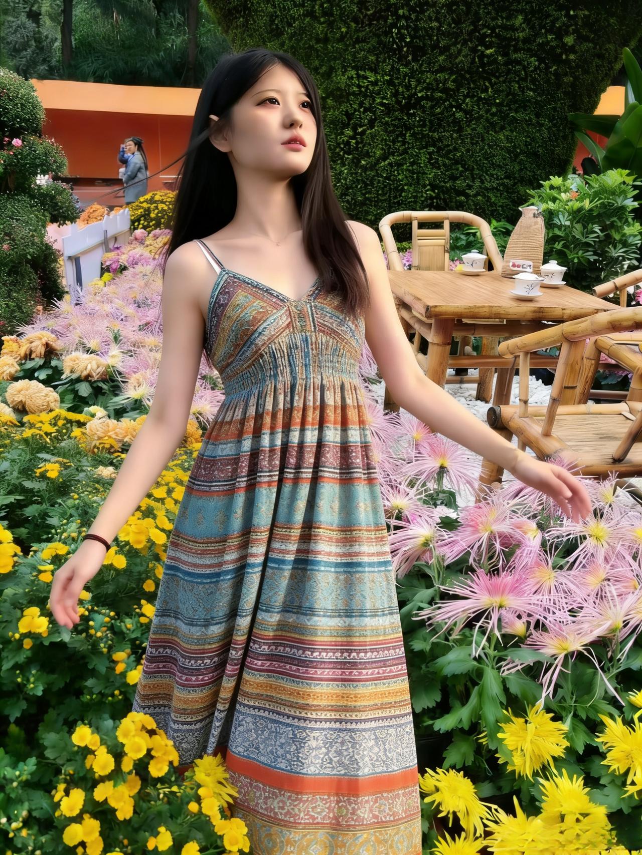 彩条罗裙曳晓风,菊丛深处立芳容。 黄英绕径凝霜白,粉蕊临溪映日红。 竹几陈茶邀客饮,石泉流韵伴君慵。 莫言秋景多萧瑟,一笑嫣然胜春秾。
