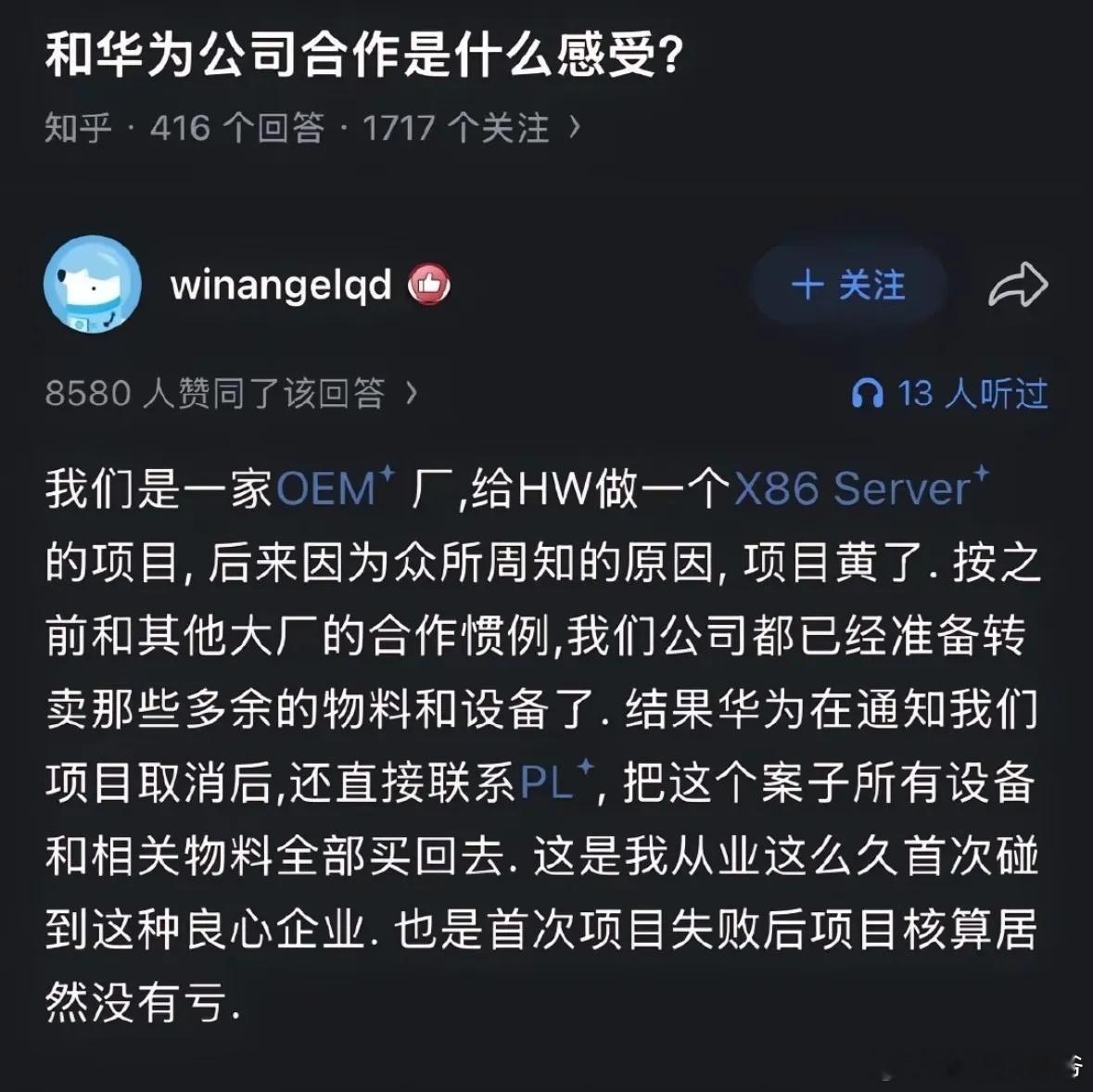有网友分享了和一线大厂华为的合作感受,项目黄了准备售卖多余的物料设备,但是华为全部买走了,最后核算项目竟然没有亏!