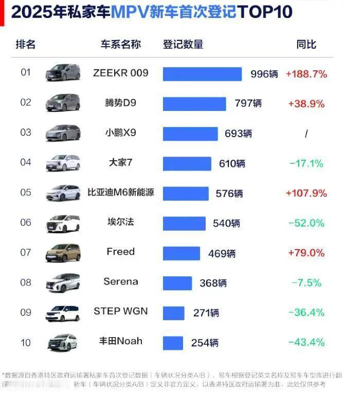 现在香港人买保姆车的口味彻底变了,以前只认丰田埃尔法这些日系车,现在国产新能源MPV直接冲到销量第一,日系车被挤到后面去了。 2025年香港MPV销量榜里,极氪009卖了近千辆排第一,腾势D9、小鹏X9紧随其后,包揽前三,而丰田埃尔法直接跌到第六,销量还砍了一半。大家7、比亚迪M6新能源也进了前五,前十里国产车占了六个席位。 国产MPV能逆袭,主要是产品力强,配置高、动力好,还有智能座舱和辅助驾驶,比日系车先进不少。而且香港电价便宜,新能源车用起来成本低很多,一年能省好几万。以前日系车贵还配置一般,现在国产车兼顾商务和家用,价格还实在,自然成了香港人的新选择,日系保姆车的垄断时代算是彻底结束了。
