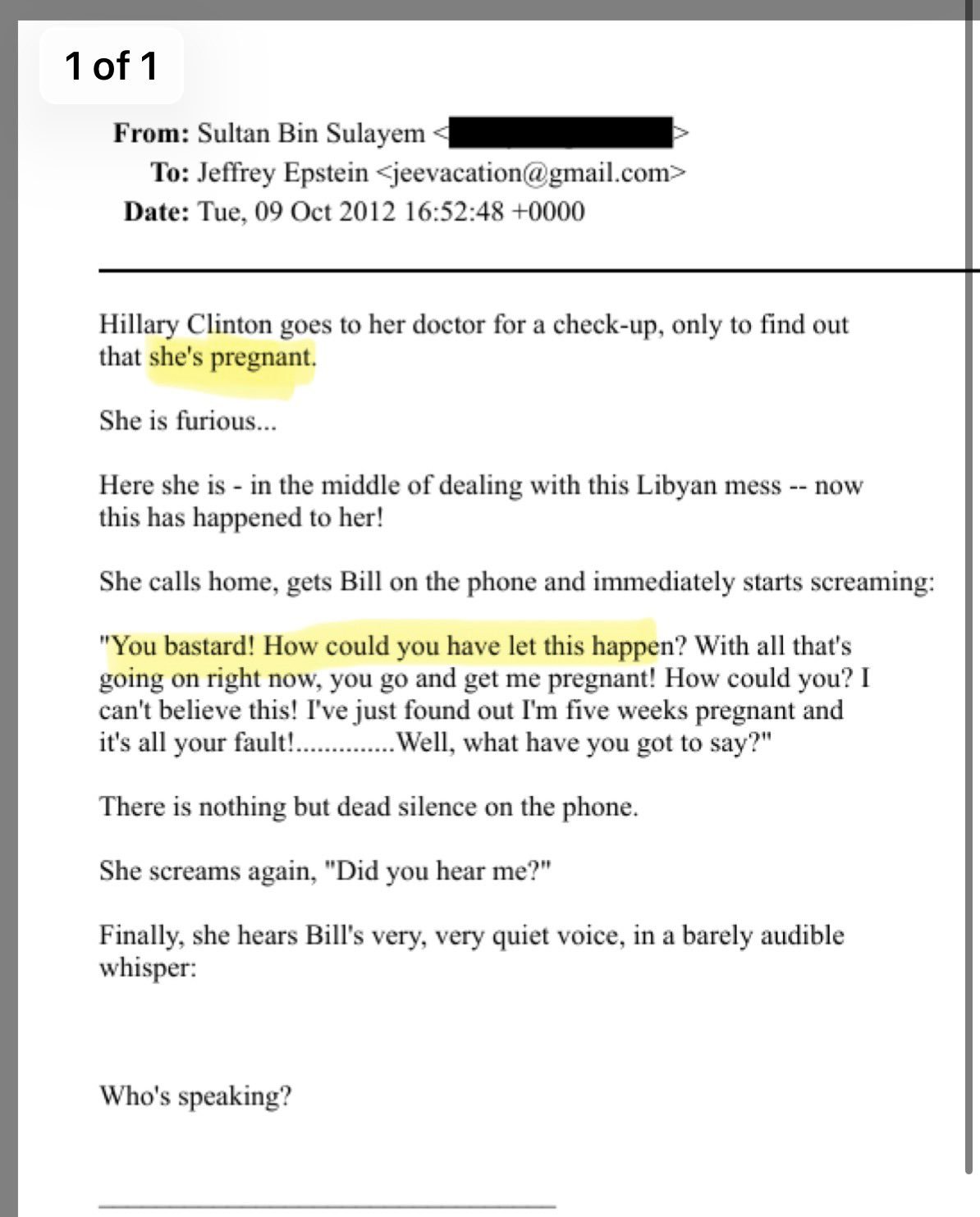 🔻爱泼斯坦档案中的小头故事一则,由苏丹·本·苏莱姆发给爱泼斯坦:🔹希拉里·克林顿去看医生做检查,结果发现自己怀孕了。🔹她怒火中烧……🔹她正忙着处理利比亚的那堆烂摊子呢——现在居然又发生这种事!🔹她给家里打电话,接通后立刻对比尔克林顿吼叫起来:“你这个混蛋!你怎么能让这种事情发生?在眼下这种时候,你居然让我怀孕了!你怎么能这样?我简直不敢相信!我刚发现自己已经怀孕五周了,这都是你的错!喂,你还有什么话可说?”🔹电话那头一片死寂。🔹她再次尖叫质问:“你听到我说话了吗?”🔹最终,她听到了比尔非常、非常微弱的声音,几乎难以察觉地低声说:🔹“你是哪一位?”🔻比牢a的小头故事精彩啊。谁说美国人不懂幽默?弥补了美国笑话不好笑的遗憾。特朗普政府为何急于将爱泼斯坦案翻篇海外新鲜事热点现场比尔盖茨回应爱泼斯坦案
