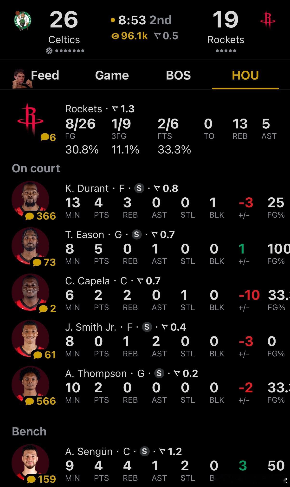 今日首发出炉,杜兰特复出、杰伦·布朗缺战👀▪️休斯顿火箭队(主队)首发阵容:1