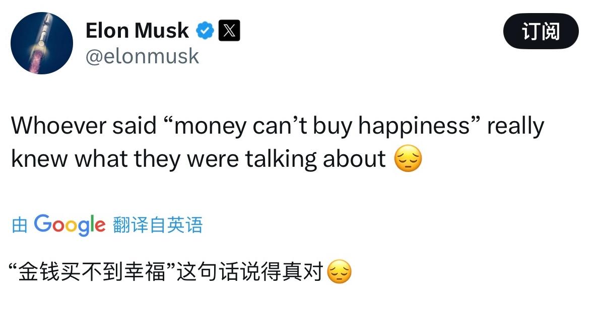 2月5日,马斯克发文表示:“金钱买不到幸福。” 套用白云女士那句经典反问:“怎么滴,抑郁了?”[抠鼻] 记得范伟范大师曾说过一句经典台词:“幸福与贫富无关,与内心相连。” 眼看春节将至,建议老马多没事看看中国小品——既能解压,又能涤荡心灵。