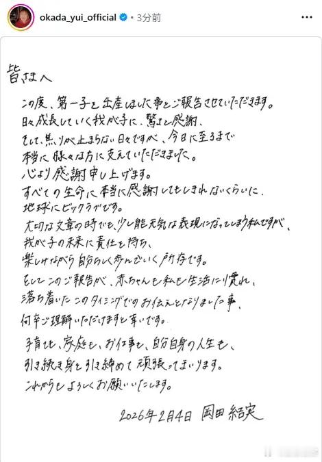 冈田结实于4日官宣诞下第一胎!去年4月,她官宣与圈外男性结婚。