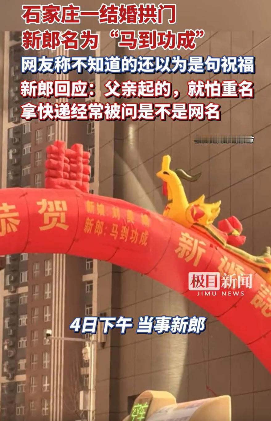 这位新郎火了!河北石家庄,一对新人结婚,可谁也没想到,新郎的姓名却成了焦点,新郎姓马,父亲给他起名叫“马到功成”,新郎表示,虽说不再有重名的顾虑,但这样的名字生活中也给他带来了新的困扰 新人结婚本是寻常事,大家多是看看热闹,沾沾喜气。但这场婚礼有些不同,大门口喜庆的拱门上,新郎的名字让来往路人都得多瞧两眼。当天一位网友早上出门,远远看见拱门,第一眼扫过去,还以为是祝福语。走近了仔细一看,愣住了,原来不是常见的“马到成功”,而是“马到功成”,而且是新郎的姓名 一字之差,意思相近,但放在人名里,就显得格外特别。视频传到网上,这位叫“马到功成”的新郎一下子火了 新郎事后说起自己的名字,有些无奈,也有些理解。他是00后,这个名字是父亲当年给起的。父亲的想法很直接:不怕重名,全国估计都找不出第二个 确实,从小到大,他几乎没遇到过同名的人。但这名字也带来了不少趣事和麻烦。比如收快递、点外卖,对方核实信息时总会多问一句:“您这名字是网名吧?”每次他都要解释,这是真名,身份证上的名字 至于父亲为什么选了这个词,又为什么用了“功成”而不是更常见的“成功”,新郎说自己也没细问过。或许父亲当年就是希望儿子人生顺利,事业有成,取个吉利寓意。只是这寓意太鲜明,直接成了名字,伴随一生 也有网友质疑:重名怕什么很正常嘛,非要起一些稀奇古怪的名字 这话其实有道理。名字的本质是一个人的代号,好记、好认、好写,才是它最基本的功能。那些流传了几十年的常见名字,之所以常见,正是因为它们顺口、顺耳,被大多数人接受 可话说回来,谁不希望自己的孩子独一无二呢?这种心情,为人父母后更能体会。所以现在很多家长在取名时,会翻古籍、查诗词,甚至找专业取名师傅