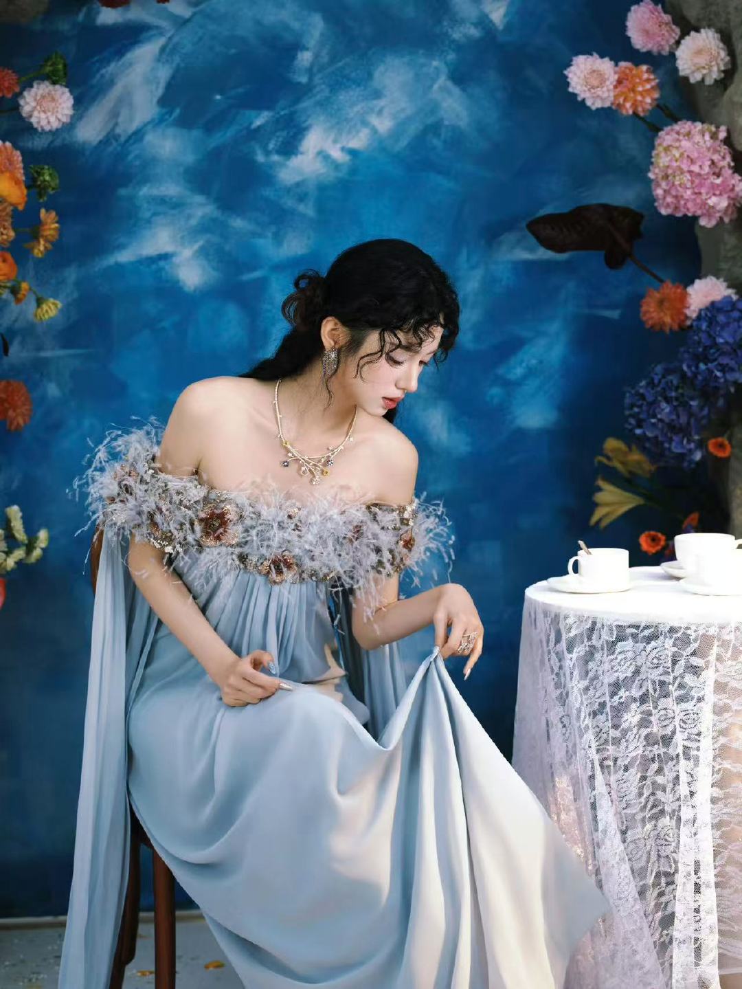 周也海妖塞壬周也蓝色羽毛一字肩裙我勒个也子美成啥了周也