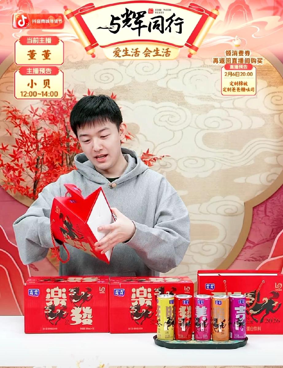 董董太逗了!哈哈,这话你敢当你哥的面说吗?估计你不敢。 董董刚刚讲杏仁露时,杏仁露厂家也是很给力,临近年关换了包装,换成马年经典包装,所有罐上都有吉祥祝福语,有马上旺,马上发,马上美,马上吉,马上乐等。 不得不说,厂家真的很用心。过年的时候,如果大家拿到这样的饮料时,看到这样的吉祥祝福语,也会开心很多。 董董说:“你看这有马上旺、马上发、马上美、马上乐、马上吉,这都是很好的祝福语,可不是说有这功效啊。” 关键是他后面说的一句,他说:“这要是有马上上班,我就马上给撇了。”真是太搞笑了! 不过我觉得董董这是口是心非,逗大家乐一乐呢,他是很喜欢上班的。可能是有了董礼貌以后会有更多牵挂,每次下班的时候估计是以最快的速度飞奔回家的。 董董之前还说过过年要把董礼貌带到公司来呢,不敢想象这个团宠的小公主来公司会是什么样场景。希望董董到时多给大家分享一些视频吧。 董宇辉 与辉同行