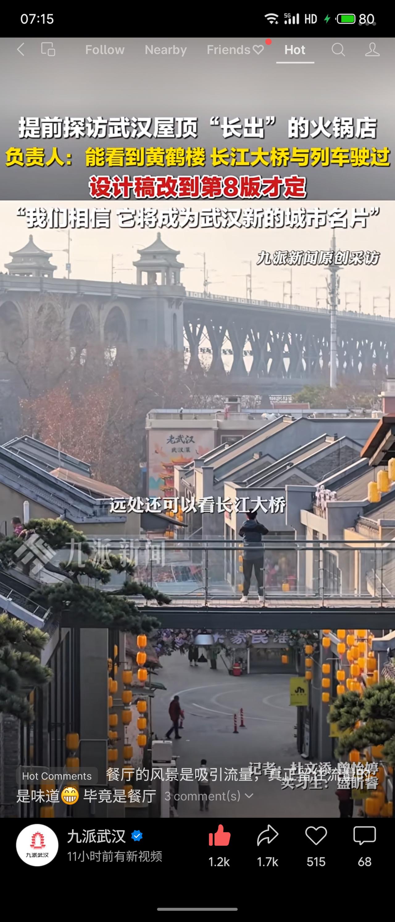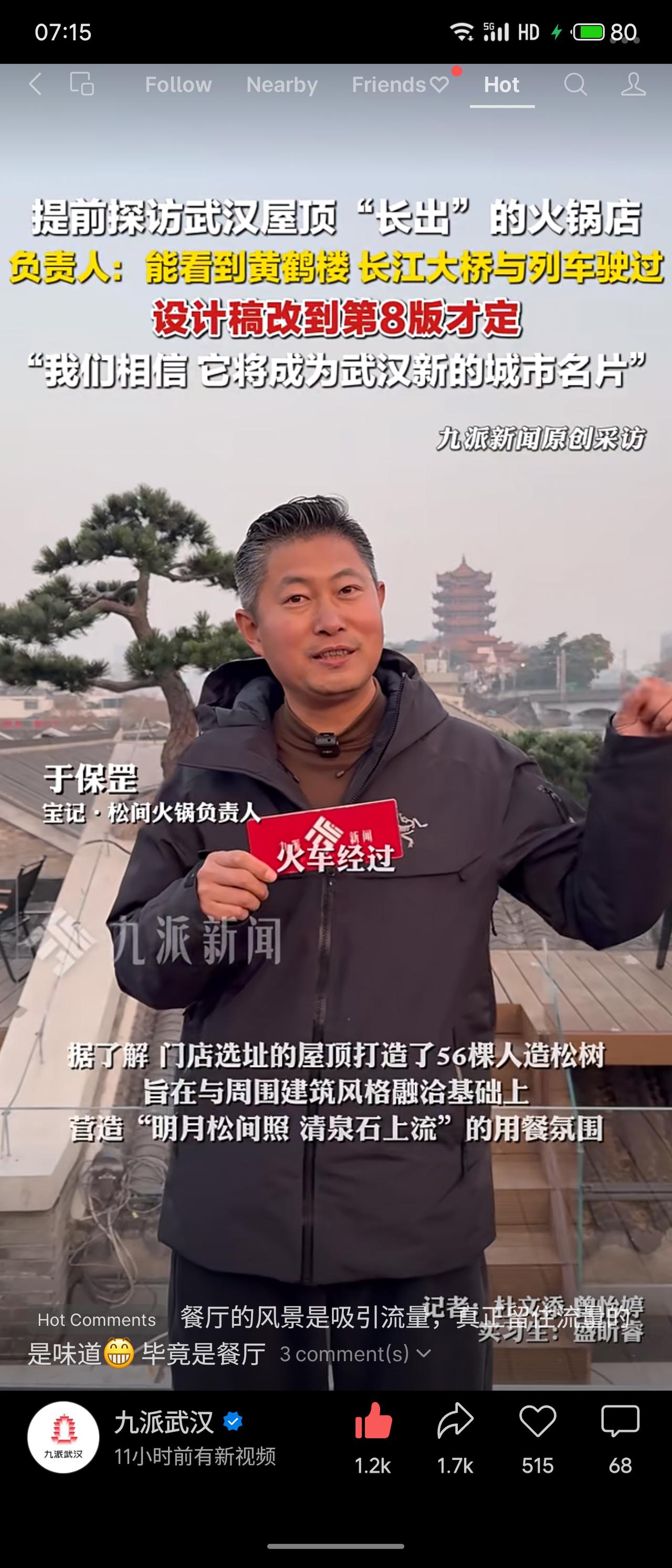 武汉斗级营一家屋顶火锅店将于2月6日试营业,设计稿修改8版定稿,屋顶布置56棵人造松树营造诗意氛围。食客可远眺黄鹤楼、长江大桥及列车穿行,负责人希望其成为武汉新城市名片。