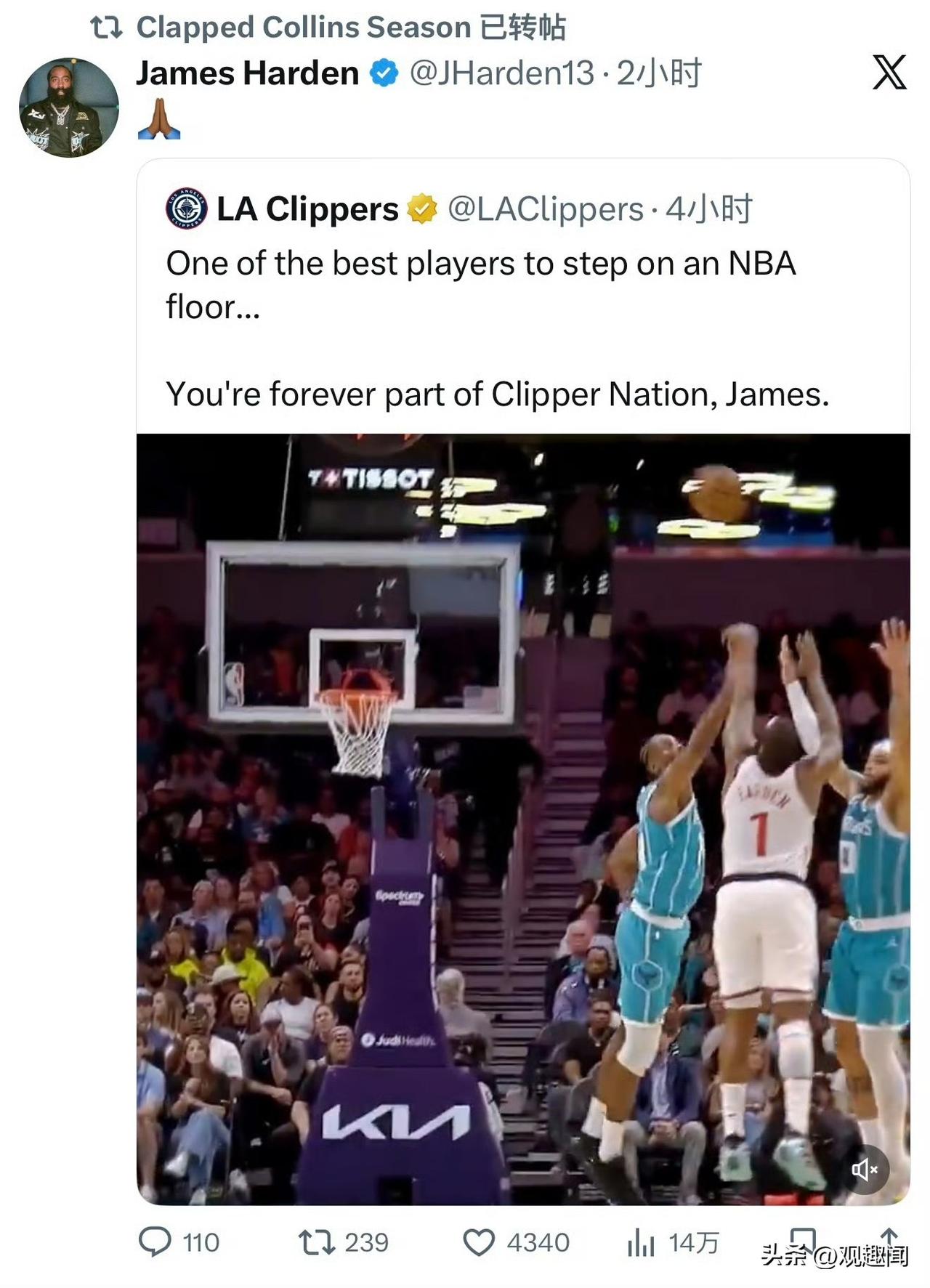 哈登转发快船致敬视频! 哈登离开快船加盟骑士后,快船官方发布了致敬哈登的专属视频,回顾其为球队效力期间的高光瞬间,而哈登本人也第一时间转发了这支视频,并配上了合十的🙏表情,简单的一个表情却饱含多重深意,成为球迷热议的焦点。 而哈登转发视频并配🙏表情的举动,更是让不少球迷动容。 值得一提的是,哈登转发致敬视频的时间,恰逢骑士客场挑战快船的焦点之战,这也让这场比赛更添一层特殊的意义。此时的哈登虽因交易流程尚未完成无缘登场,但他的名字始终萦绕在这场比赛的上空,快船球迷在看到致敬视频后,也纷纷在评论区留言,表达对哈登的不舍与祝福,有球迷表示“哈登为快船拼过,感谢你的付出”,也有球迷直言“这个告别太暖心了,祝登哥在骑士一切顺利”。