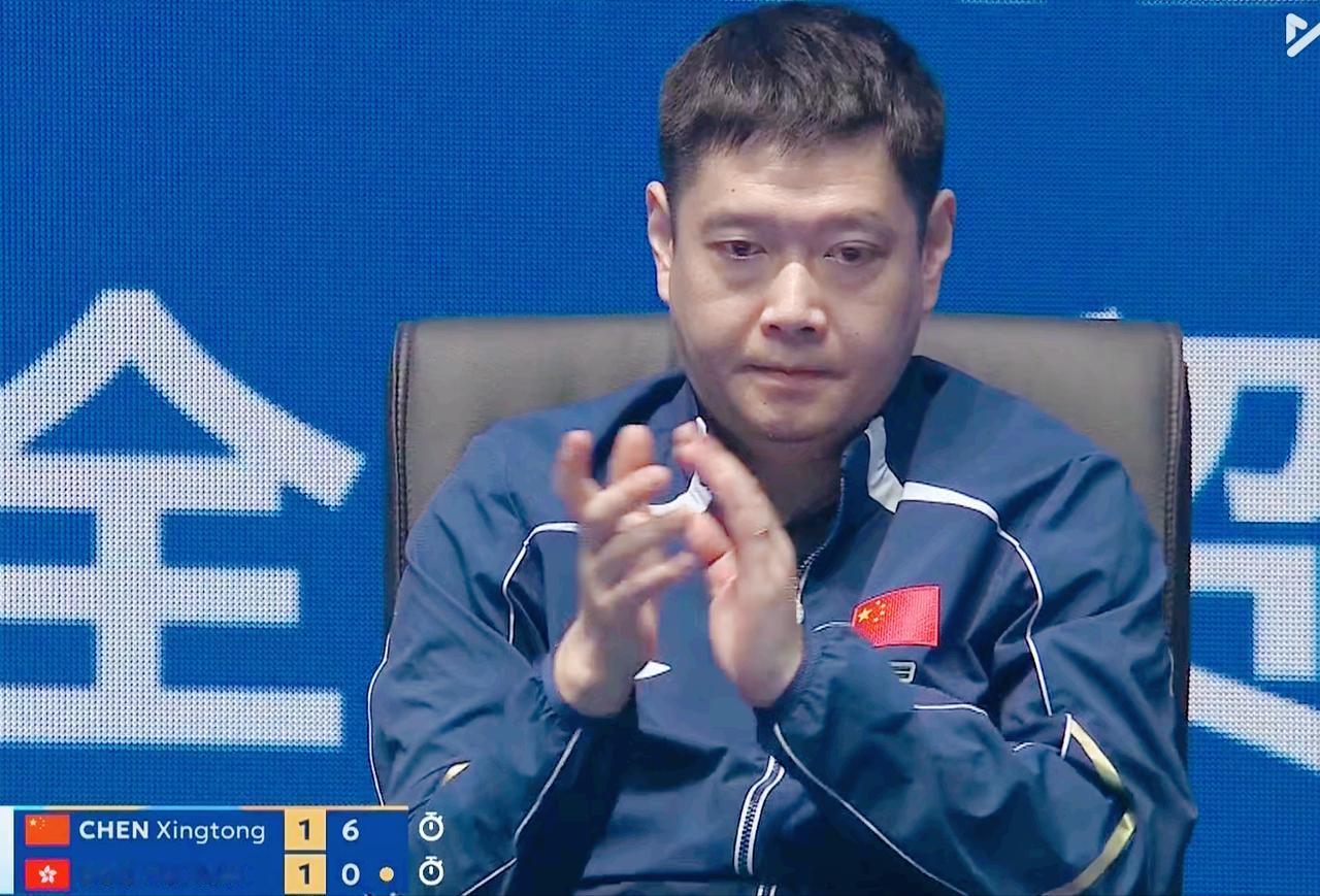 厉害了!邱贻可果然很有战术眼光。 杜凯琹对同同十战全输, 所以今天打的就是搏杀, 基本就是一板决定胜负。 第一局杜姐还真就搏赢了, 11:7拿下。 第二局 同同1:4落后,叫了暂停, 找邱贻可抱怨。 邱贻可提醒她, 杜凯琹是在搏杀, 不要影响心态, 按照赛前的战术打就行。 同同按照邱贻可战术, 11:8拿下第二局, 两人扳平了。 第三局陈幸同6:0开局, 9:1领先, 11:4拿下