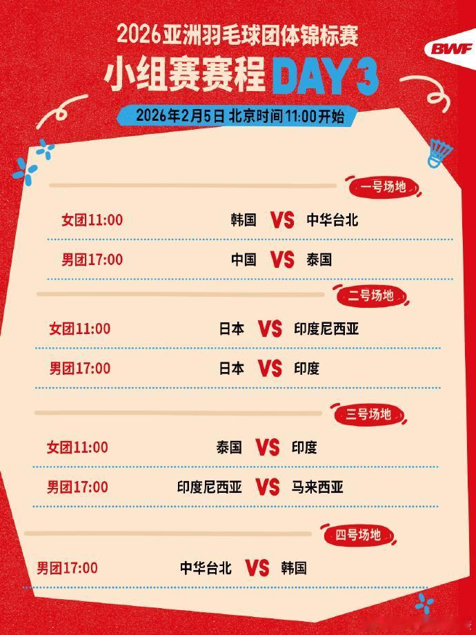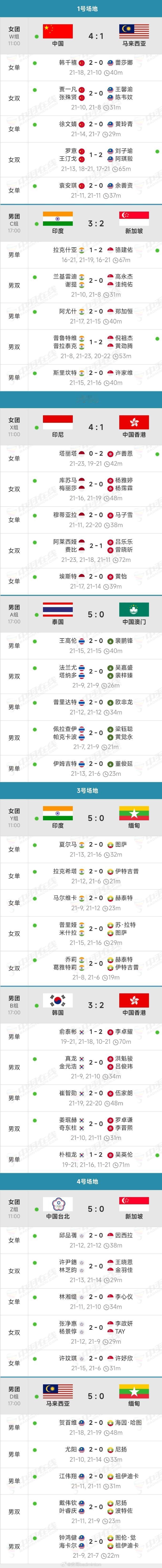 2026亚锦赛团体赛 中国女团迎开门红,可惜不是5比0 2026年亚洲羽毛球锦标赛团体赛,2月4日结束了第2个比赛日的争夺,中国女团也取得开门红,4比1击败马来西亚女团,可惜女双罗意/王汀戈1-2不敌刘子瑜/阿琪翋,未能取得5比0的成绩。 女团 中国4-1马来西亚 -韩千禧2-0(21-18,21-10)蕾莎娜 -贾一凡/张殊贤2-0(21-10,21-8)王馨渝/陈韦妏 -徐文婧2-0(21-17,21-7)黄玲青 -罗意/王汀戈1-2(21-13,18-21,17-21)刘子瑜/阿琪翋 -袁安琪2-0(21-11,21-11)余善资 男团小组赛第2日赛况 印度3-2新加坡 拉克什亚16-21 21-19 16-21骆建佑 兰基雷迪/谢提21-10 21-8高永杰/洼纯佑 阿尤什21-17 21-15郑加恒 鲁普特维/普拉泰克21-8 21-23 20-22倪祖杰/黄劲腾 斯里坎特21-15 21-16许家维 泰国5-0中国澳门 王高伦21-15 21-15裴鹏锋 法拉尤/塔纳多21-9 21-9吴嘉盛/裴梓臻 普里达特21-12 21-12欧非龙 佩拉查伊/帕克卡波21-7 21-9梁钰聪/黄觉永 伊姆吉特21-13 21-6董俊延 韩国3-2中国香港 俞泰彬19-21 21-18 10-21李卓耀 真龙/金元昊21-9 21-10洪魁骏/吕俊玮 崔智勋21-19 22-20伍家朗 姜珉赫/奇东柱21-10 21-11罗卓谦/李晋熙 朴相龙19-21 21-16 11-21吴英伦 马来西亚5-0缅甸 贺首维21-18 21-19海因·哈图 尤阳21-10 21-14尼扬 江伟翔21-11 21-11祖伊迪卡 戴伟钦/叶睿庆21-11 21-9尼扬/波特佐 钟鸿健/海卡尔21-9 21-7图伦·觉/祖伊迪卡 女团小组赛第2日赛况 印度尼西亚4-1中国香港 塔丽塔21-23 19-21卢善恩 库苏马/梅丽莎21-16 21-19杨雅婷/杨霈霖 穆蒂亚拉21-11 22-20马子雪 阿莱西娅/费比21-23 21-18 21-11吕乐乐/曾晓昕 埃斯特21-17 21-14黄怡 印度5-0缅甸 夏尔马21-13 21-16图萨 拉克希塔21-12 21-6伊特吉普 马尔维卡21-9 21-12赫泰特 普里娅/米什拉21-15 21-16苏·拉特/图萨 乔莉/葛雅特莉21-8 21-6赫泰特/伊特吉普 中华台北5-0新加坡 邱品蒨21-12 21-12因西拉 许尹鏸/林芝昀21-13 21-14王晓恩/金羽佳 林湘缇21-11 21-10李心仪 张净惠/杨景惇21-12 21-9李政妍/TAY 许玟琪21-15 21-6许妤欣