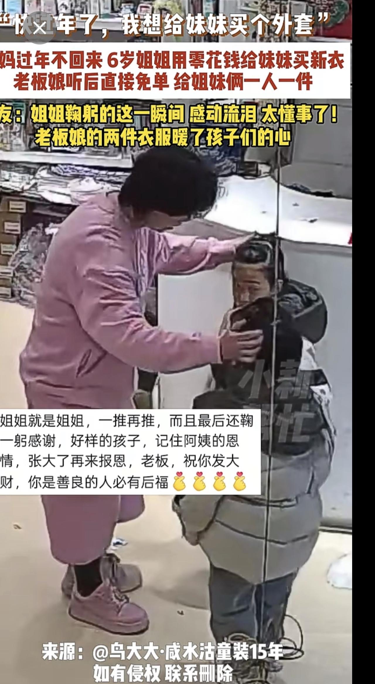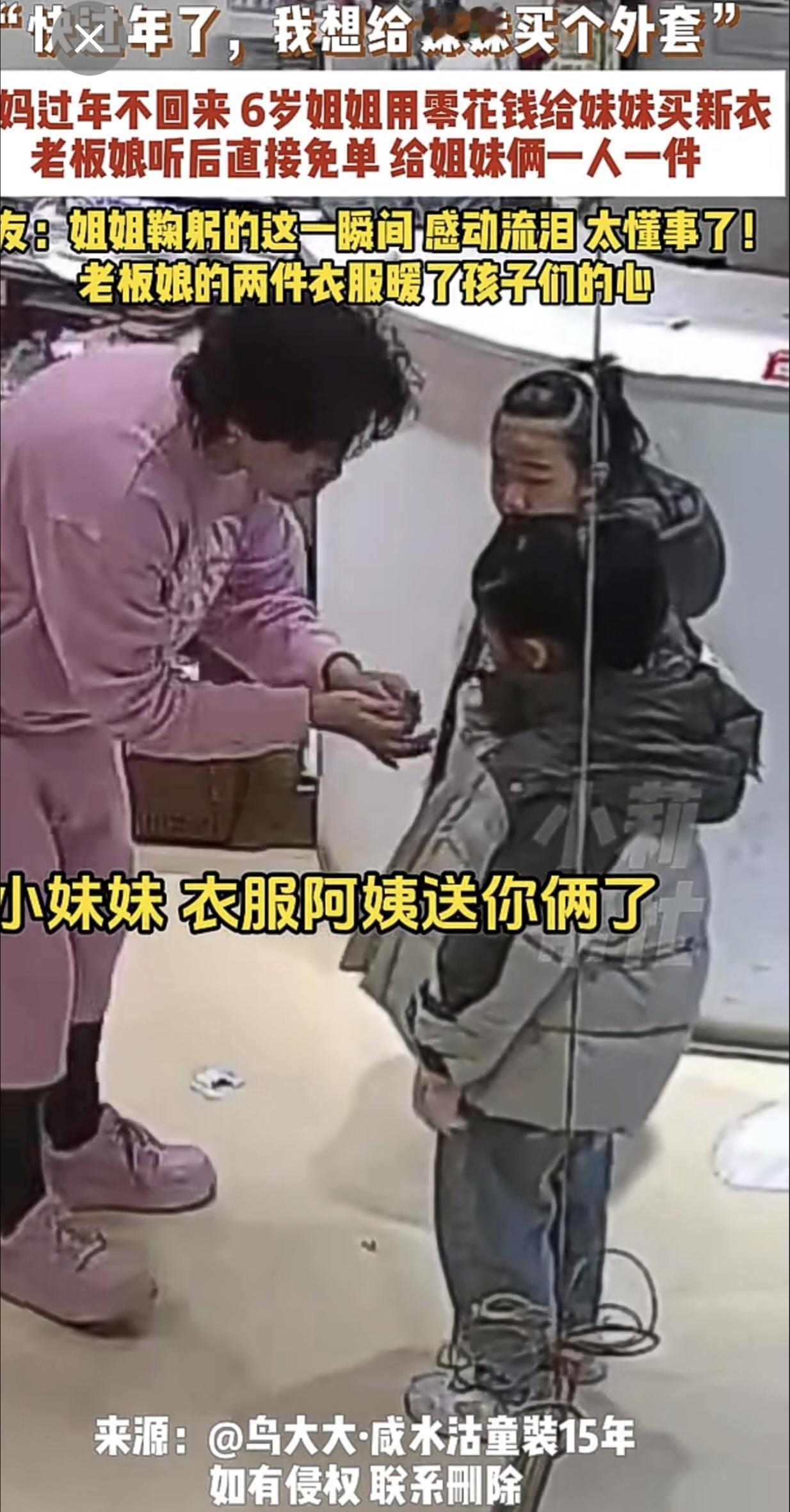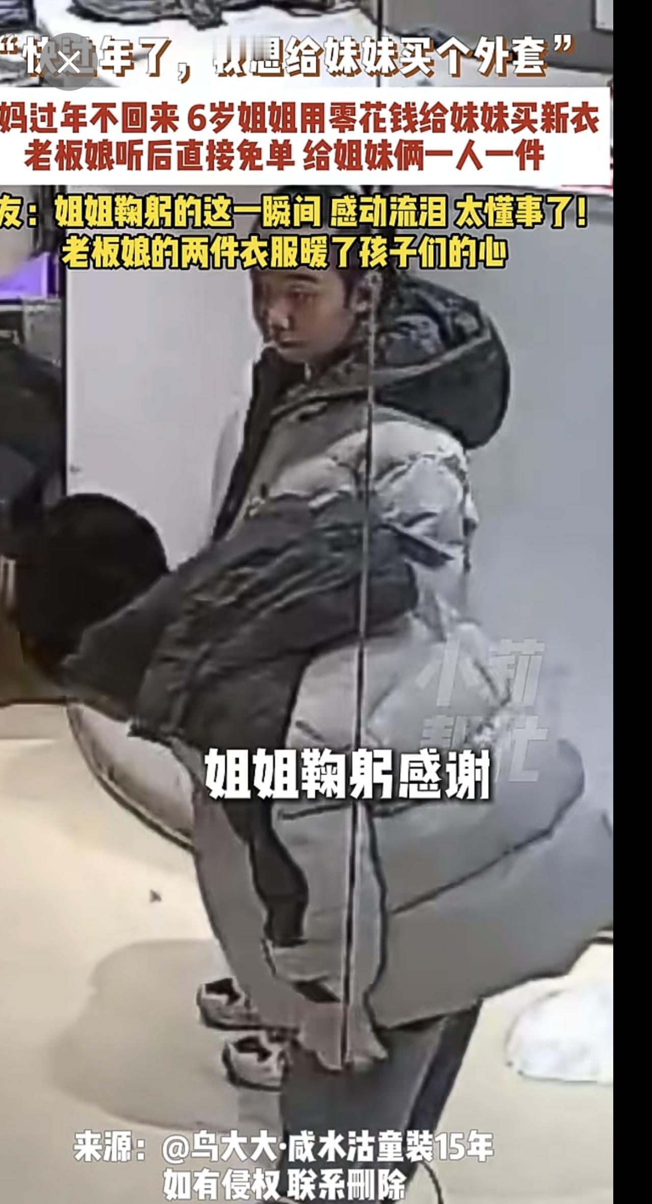 2月4日,天津,“快过年了,我想给妹妹买个外套”,爸妈过年不回来,6岁姐姐用零花钱给妹妹买新衣,老板娘听后直接免单,给姐妹俩一人一件,网友:姐姐鞠躬的这一瞬间,感动流泪,太懂事了!老板娘的两件衣服暖了孩子们的心。