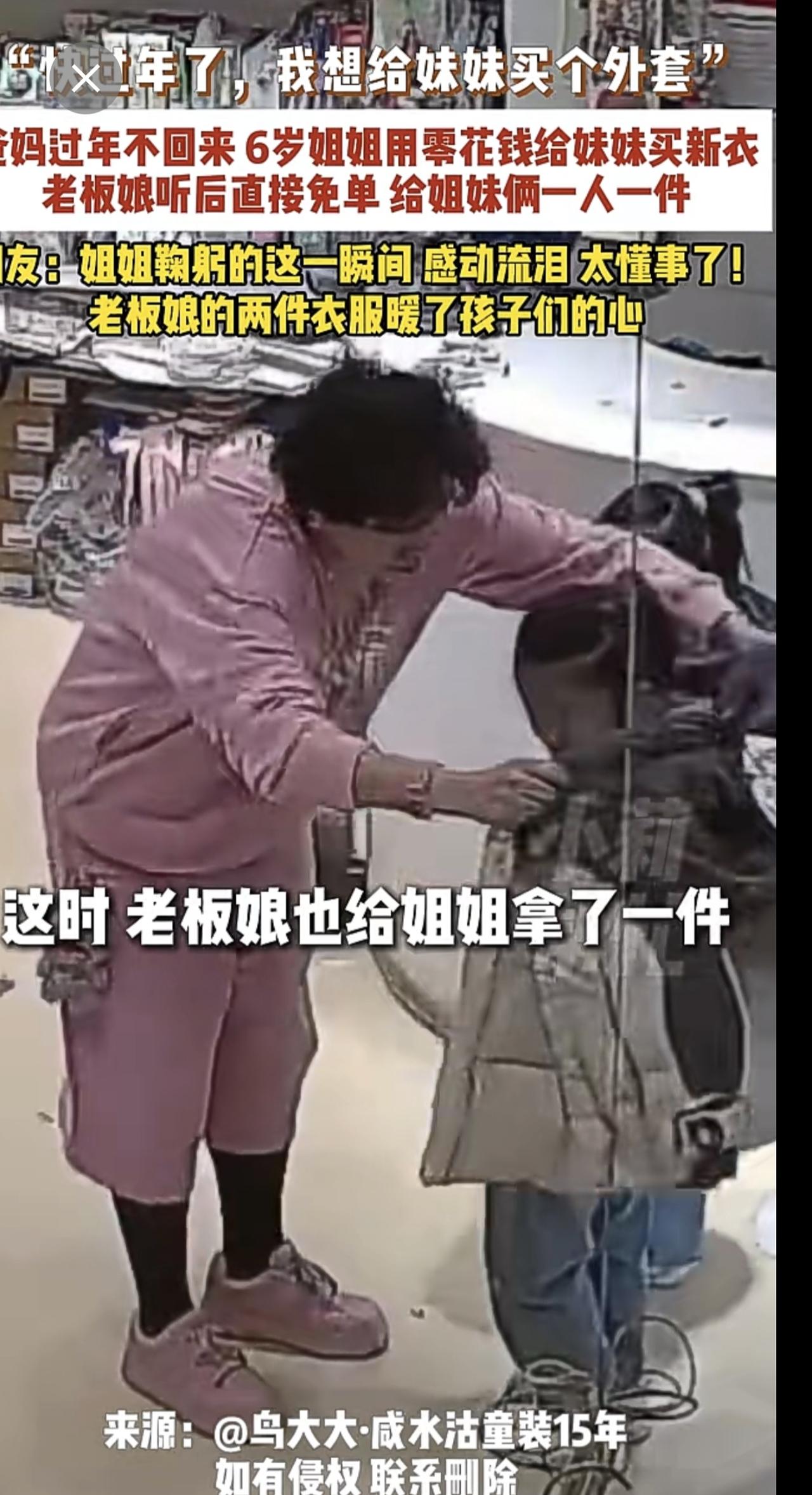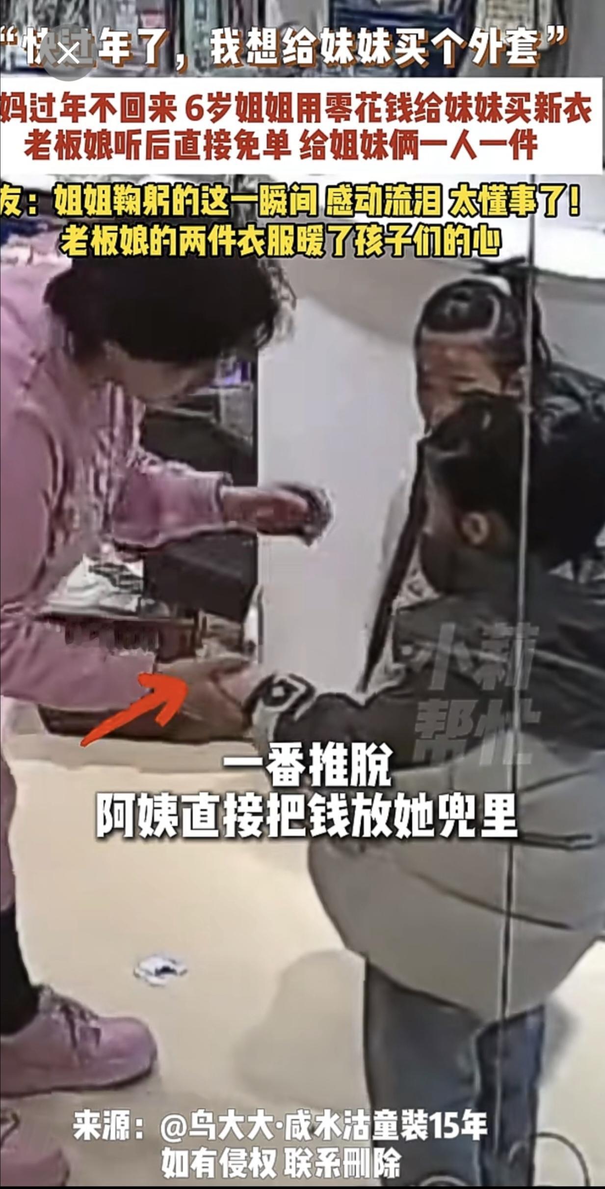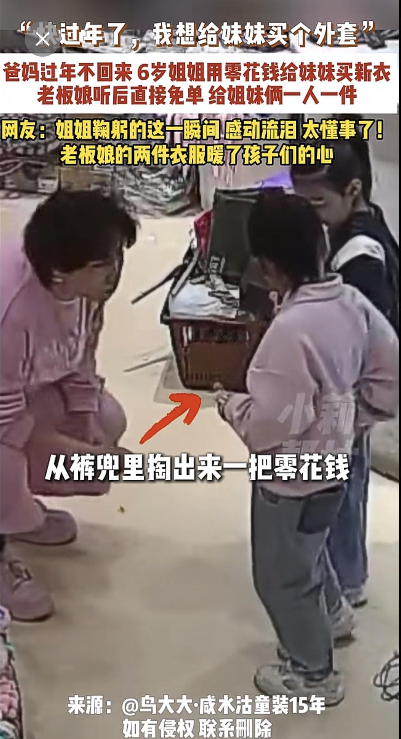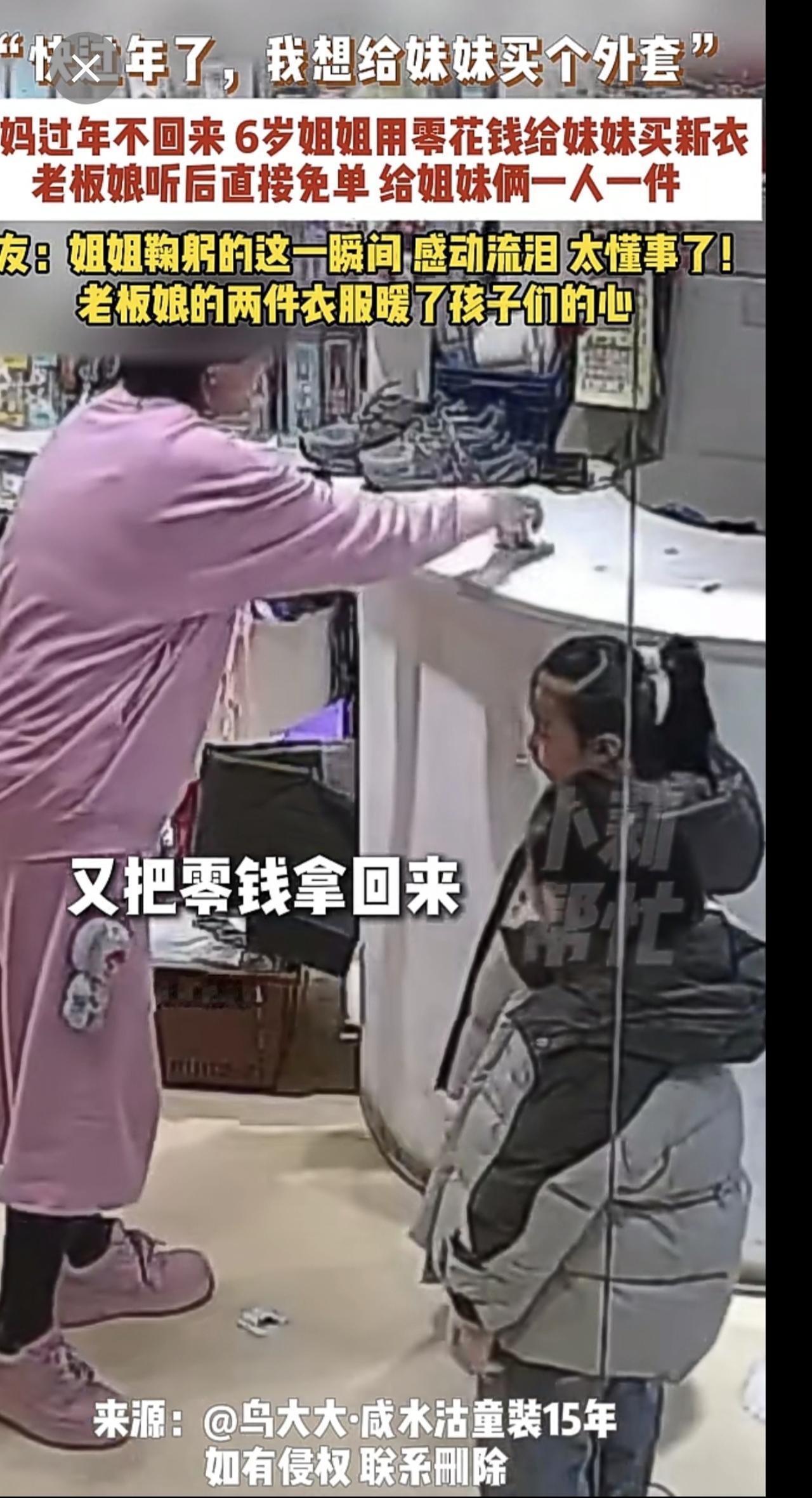 2月4日,天津,“快过年了,我想给妹妹买个外套”,爸妈过年不回来,6岁姐姐用零花钱给妹妹买新衣,老板娘听后直接免单,给姐妹俩一人一件,网友:姐姐鞠躬的这一瞬间,感动流泪,太懂事了!老板娘的两件衣服暖了孩子们的心。