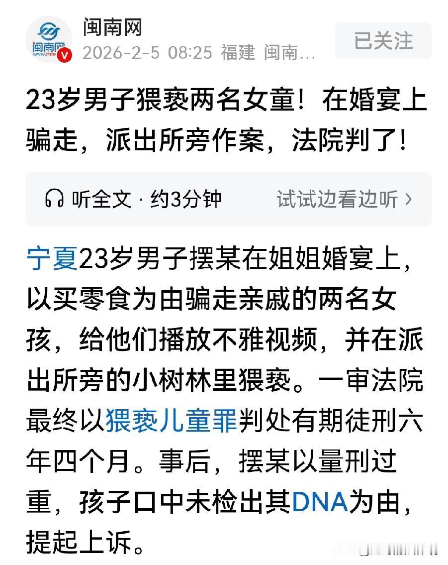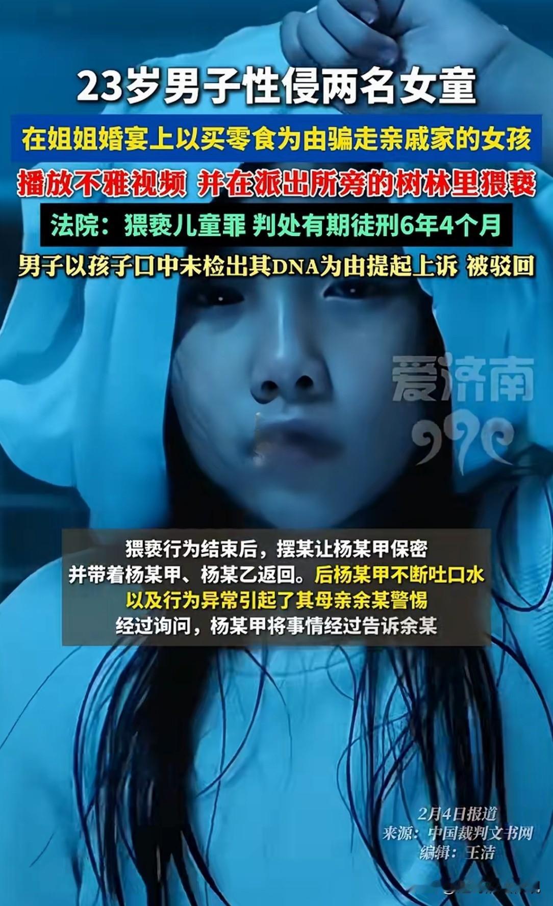 必须严惩!宁夏石嘴山,女子带两个女儿去参加婚宴,亲戚家23岁的男子,以带两女孩去买零食为由,将他们骗到树林,并强迫女孩看不雅视频,并按住其中一女孩的头,将生 殖 器放入女孩口中猥 亵。男子被抓,一审,被判有期徒刑6年4个月,男子不服,称女孩口中未检出DNA,二审,法院这样判! 余某接到亲戚家的喜帖,被邀请去参加喜宴。 她带着两个女儿,7岁的大女儿杨某甲,和6岁的二女儿杨某乙前去吃酒席。 现场喜气洋洋,喜宴开始,两个女儿和余某坐在一起吃饭。 小孩子们吃的少,吃完饭就在桌边打打闹闹。 那天是摆某的姐姐订婚,家里亲戚朋友都来贺喜。 23岁的摆某,发现亲戚余某,带着自己的两个女儿。 看着两个不堪世事的小女孩,他突然就起了坏心思。 他故意接近两个女孩,和他们套近乎,还拿自己的手机给她们看。 因为都是亲戚,双方也很熟悉,摆某故意接近两个女孩,并没有引起余某的注意。 中午11点左右,摆某凑到两个小女孩跟前,小声说要带她们去买零食。 小女孩眼睛一亮,在零食的诱惑下,两女孩兴高采烈地就跟着他走了。 余某知道是自家的亲戚,也没在意。 其他人都在忙着喝酒吃饭聊天儿,就算看到了,还以为是哥哥带着妹妹们出去玩。 摆某带两个女孩离开热闹的婚宴现场,骑上电动车,将他们带到了村外。 大约12点左右,他带着孩子们来到了附近一所中学门前的凉亭。 那会儿街上人不多,凉亭附近特别安静。 他拿出手机,给两个才六七岁的小姑娘,看一些不该看的视频。 两个孩子懵懵懂懂不太明白,过程持续了大概六七分钟。 12点16分左右,摆某又骑电动车带两小女孩离开了凉亭,去了更隐蔽的地方。 那里是派出所附近的小树林,他让妹妹杨某乙在树林边待着。 然后把7岁的杨某甲带到树林深处。 他按住女孩子的头,强迫她做出了难以启齿的举动。 事后,他让杨某甲别告诉任何人,要保密。 然后就像什么都没发生一样,又骑车带着两个孩子回到了婚宴现场。 这3人一来一去,谁也没注意到。 但很快,余某就觉出了不对劲。 大女儿杨某甲不停地吐口水,眼神躲闪不敢正视她,举止很异常。 母亲心里一沉,把女孩子拉到没人的地方,轻声问她,刚才那个哥哥带她们去干什么了,是不是发生了什么? 起初孩子不肯说,只是摇头,在母亲一再询问下,7岁的女孩终于断断续续、带着恐惧和困惑,把刚才发生的事情说了出来。 可以想象,母亲当时的震惊与愤怒。 余某疯了似的冲出去要找摆某算账,亲戚们听说后,炸了锅。 场面一时失控,争吵声、怒骂声乱成一团。 双方发生冲突,余某报了警。 就这样,摆某所做所为败露了。警方介入,摆某被抓。 在派出所里,摆某一开始什么都说,他以小孩子说的话不算数为由,不承认做下的事。 在警方多次询问后,摆某才终于交代了自己的所作所为。 两个女孩子的陈述非常清晰。 她们记得是摆某带她们去买零食,在中学门口的亭子里看奇怪的视频。 记得去了派出所旁边有树的地方,也记得那些让她们害怕的触碰。 她们描述的细节,时间、地点、顺序,都符合这个年纪孩子的记忆能力,也和其他证据对得上。 因事实清楚,摆某被检方提起公诉。 一审,法院审理后认为,摆某明知两个孩子是不满14周岁的幼女。 为了寻求刺激,给他们观看不雅视频,后又对其中一幼女实施严重的猥亵行为。 因情节恶劣,已经构成了猥亵儿童罪。 一审,法院判处,摆某有期徒刑6年4个月。 摆某对一审判决不服。 他提出了上诉,理由主要有两点:一是觉得判得太重了; 二是警方从孩子口腔里没有检测出他的DNA,他觉得证据不足。 依据《刑法》第237条第3款:“猥 亵儿童的,处5年以下有期徒刑; 有下列情形之一的,处5年以上有期徒刑:(1)猥亵儿童多人或者多次的; (4)猥亵手段恶劣或者有其他恶劣情节的。 法律规定,只要对不满14周岁的儿童实施猥 亵,即使没有造成身体伤害,也构成犯罪; 若情节恶劣,刑期会在5年以上。 摆某以买零食为由,骗走7岁和6岁女童,带她们看不雅视频,并对7岁女童实施猥亵,属于情节恶劣。 DNA问题,鉴定意见确实写着“未检出”。 根据法律规定,DNA检测结果,在这类案件里,只是证据的一种。 它很重要,但并不是唯一的决定因素。 尤其是对侵害未成年人的案件,法律和相关司法解释有着特别的考量。 只要孩子的陈述稳定、自然,细节吻合,能够与其他证据相互印证,而且排除了被人指使、诬陷的可能性。 在这种情况下,即便没有生物检材的印证,孩子的说法也足以被采信。 至于量刑,一审法院已经充分考虑了他的犯罪情节:在公开场合骗走幼女。 在派出所附近公然作案,对年幼的女孩子,造成的身心伤害。 6年4个月的刑期,是在法律规定的幅度内做出的裁量,并无不当。 最终,二审法院驳回了摆某的上诉,维持了原判。