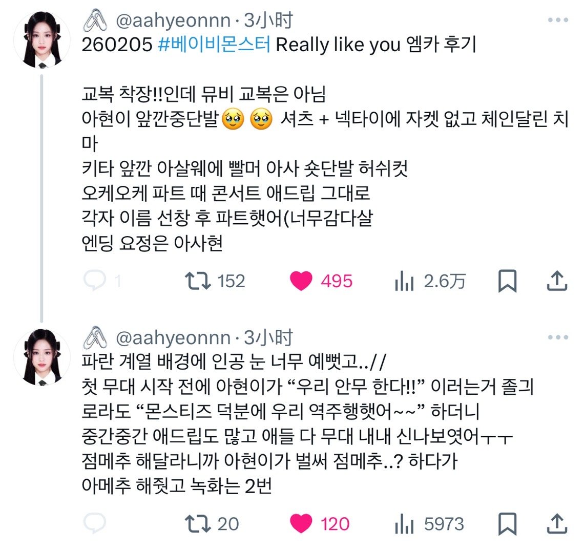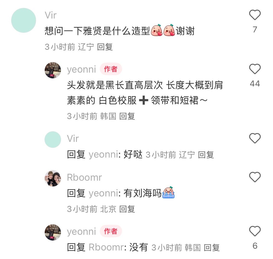 雅贤是没有刘海的齐肩发~造型是衬衫+领带 没有穿外套 配了带链条的裙子(类似于图3)开场舞台前雅贤说"我们来跳编舞啦!!" 样子真的超可爱 舞台中途还加了好多即兴小互动今日份逆应援是三明治还有拍立得小卡