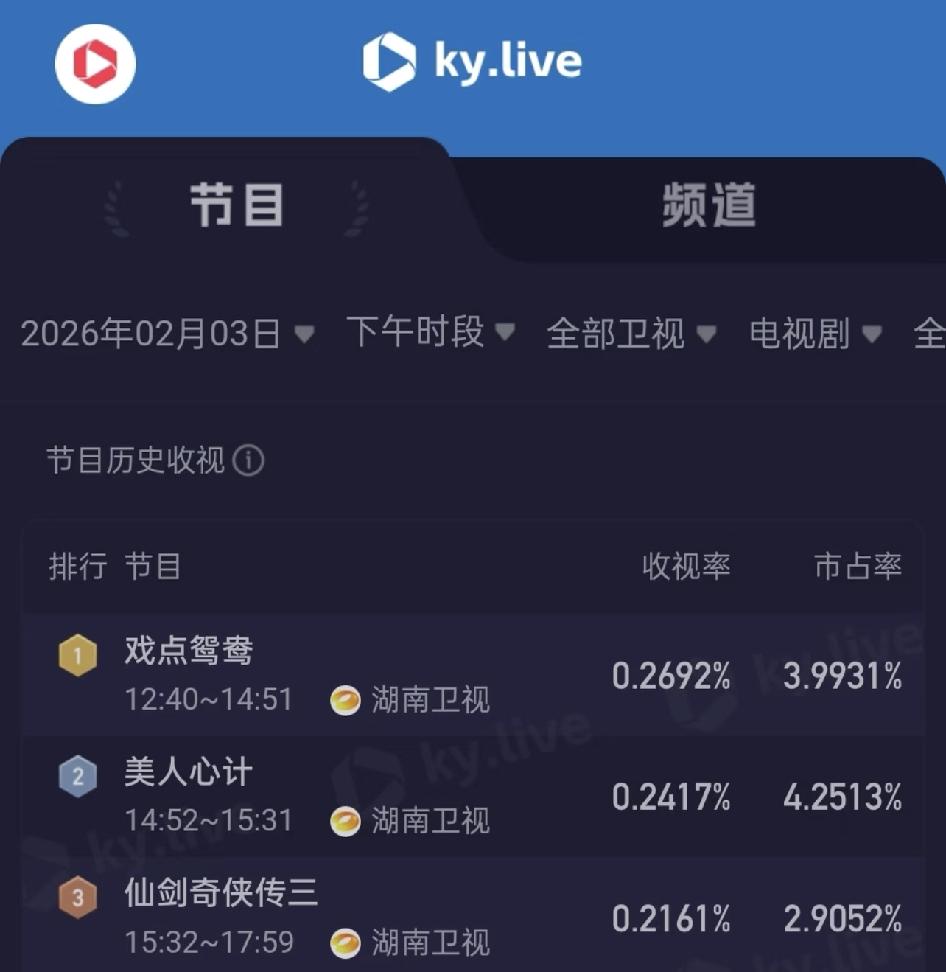 湖南卫视重播《美人心计》收视率排名第二 排名第一、三也是湖南卫视午后重播《戏点鸳鸯》下午重播《仙剑奇侠传三》。湖南台是真有眼光,知道播以前的好剧,现在很少看电视了,反正我每次调到湖南台都会停下看,不看当个背景音也很棒。