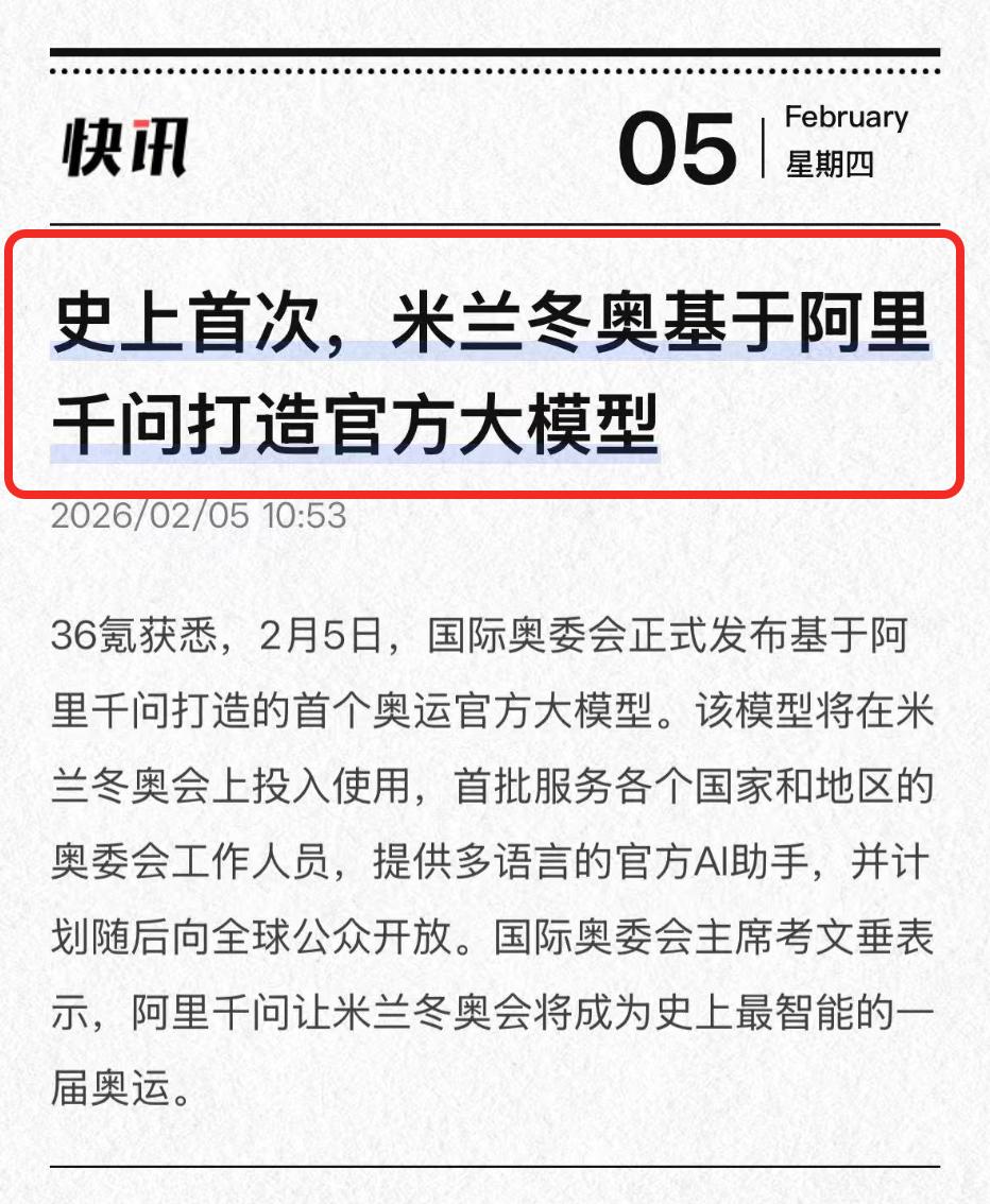 硅谷统治科技的时代正在转变,米兰冬奥会将采用中国AI技术! 米兰冬奥会冰雪大战的精彩戏码即将上演,而在这之前,中国的科技先给了世界一点小小的震撼, 阿里云千问直接让这一届的冬奥会成为了史上最智能的一届奥运会。 这并不是个人臆想凭空捏造的,而是国际奥委会主席柯丝蒂·考文垂在国际转播中心举行的活动中亲自宣布的。她说:“得益于阿里千问的技术支撑,2026米兰冬奥会展现了奥林匹克运动的智能化未来,将成为史上“最智能”的一届奥运会。” 考文垂之所以能高度称赞阿里云千问的技术能,主要还是在这届冬奥会中,基于阿里云千问的技术能力,“国家奥委会AI助手”已正式投入到了米兰冬奥会的各项工作运行中,很切实的解决了奥运场景中复杂多变的难题。 比如多个国家代表团语言不通,在过去可能需要各种翻译软件或者专门的翻译人员来进行信息同步,但现在,不同国家、不同肤色的工作人员,只需用用母语提问,AI就能精准解答从参赛资格审核到赛时后勤资源调度等一系列核心赛务问题。 这一创新应用,既降低了本届奥运会全球代表团的沟通成本,也证明了,中国AI在面对复杂问题时候的技术稳定性。 换个角度来看,米兰是在欧洲,属于硅谷科技公司的腹地,在奥运会这种世界瞩目的时刻,它们的AI大模型没有成为技术担当,反而成了中国阿里云千问的舞台。 这要往前翻个二三十年是不可想象的,如今却变成了现实呈现在我们眼前。生动的说明了一件事,那就是随着中国科技的不断努力,世界科技领域已经不再只有硅谷科技公司这一种声音,中国在科技领域的话语权也越来越被重视!