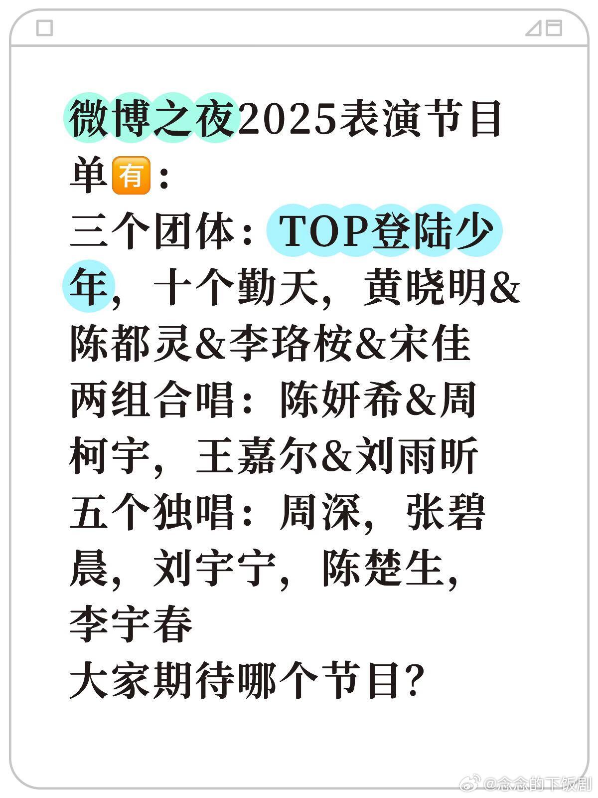 微博之夜2025表演节目单🈶:三个团体:TOP登陆少年,十个勤天,黄晓明&陈都灵&李珞桉&宋佳两组合唱:陈妍希&周柯宇,王嘉尔&刘雨昕五个独唱:周深,张碧晨,刘宇宁,陈楚生,李宇春