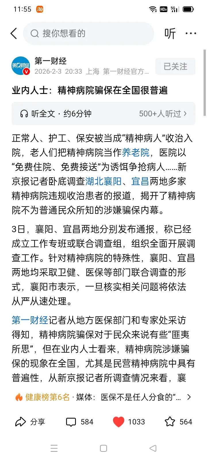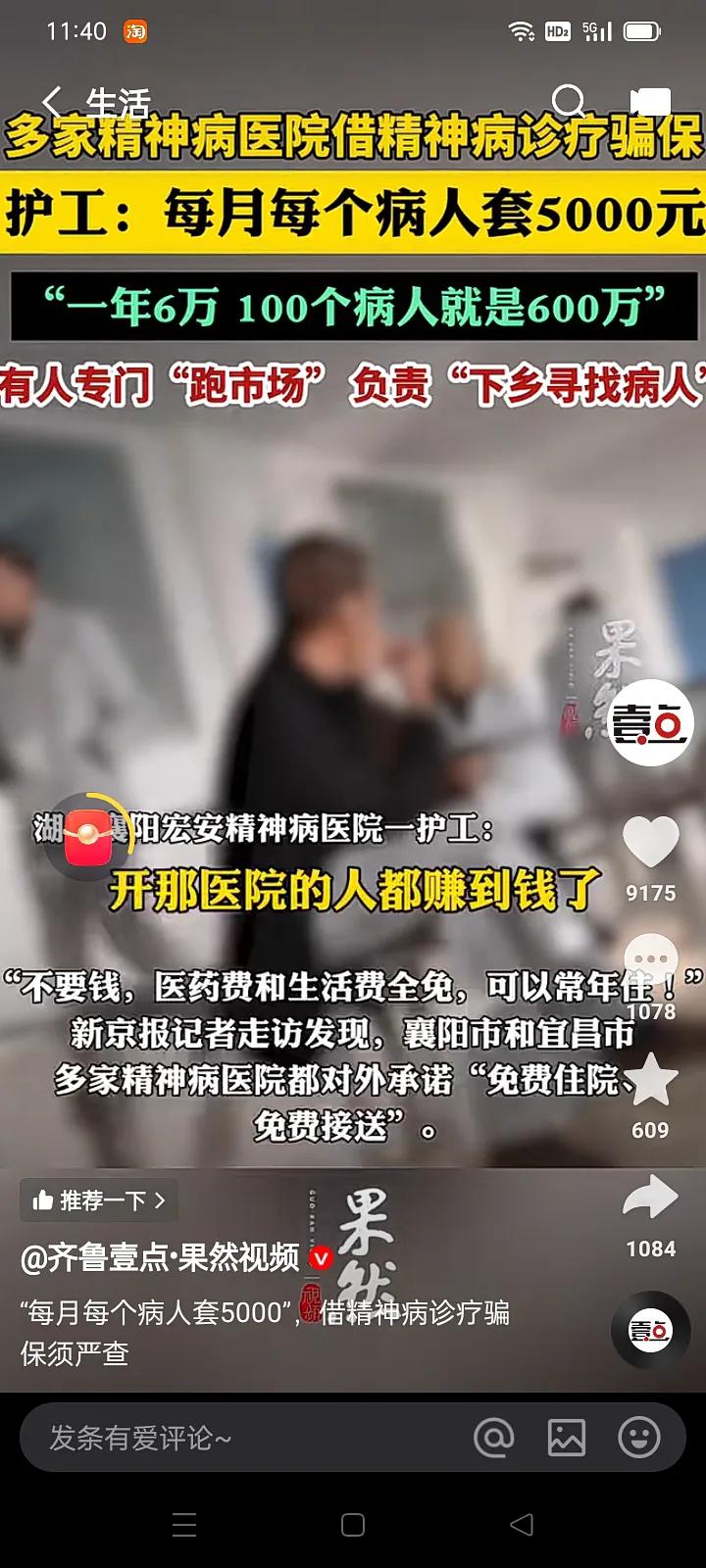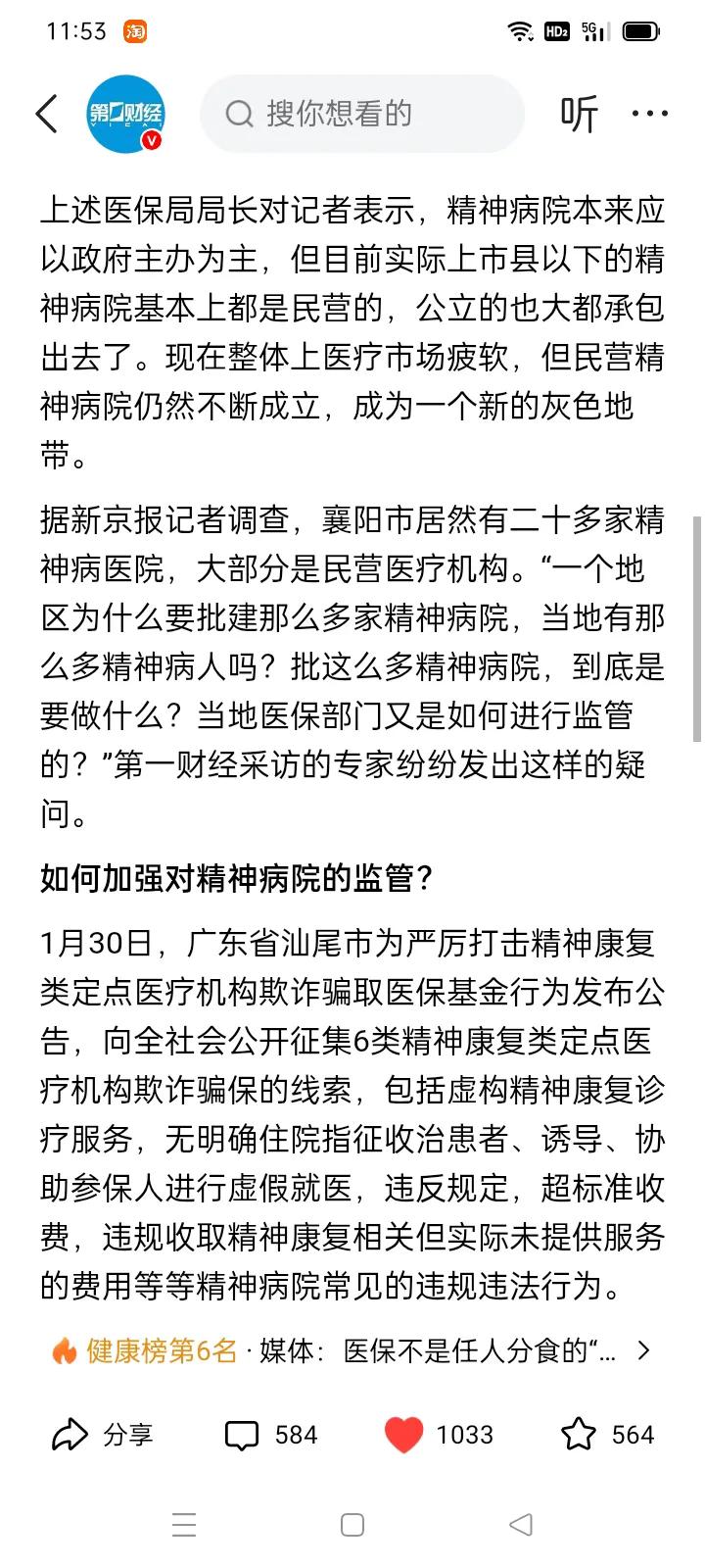 祸国殃民的黑恶精神病院,必须消灭! *襄阳市有20多个精神病院,一半病人都是正常人!医院利用一个病人,每年就可以诈骗国家医保资金6万!这样医院就打着免费食宿治疗的幌子,到处招收病人!有人来‘养老’,有人来戒酒…… 但是天下没有免费的午餐!这些胆大妄为的黑心精神病院,进来容易出去难!有的病人多次要求出院无果,等于陷入囚笼,绝望自杀了!还有的病人遭到虐待。 *《第一财经》记者采访多位医保领域公务员和专家,他们说精神病院骗保在全国是普遍现象! 1精神病院医保主要按病人住院时间来计算。 2有点地方政府担心对骗保的精神病院处理严格,可能导致真正的精神病人无人管理。 3现在绝大多数的精神病院都是私营的!极少数公立的精神病院也外包了! *我的感想:1医院是救死扶伤的地方,是保障人民生命健康和尊严的底线。本来是福利性质的,而绝不应该沦为某些利益集团大发横财的工具! 但是客观现实却是公立安全实惠的精神病院几乎绝迹,私营为牟取暴利而不择手段的精神病院却如火如荼!真是呜呼哀哉,黑白颠倒了。 2精神病院既然有国家医保资金的大量投入支持,为什么要民营化?!国家应该大力取缔名不副实的私营精神病院,恢复合理数量的公立精神病院,利国利民,善莫大焉! 3对于大量私营精神病院骗保犯罪,负有监管责任医保部门和地方政府要严厉追究责任。 4对于诈骗国家医保资金、涉嫌非法囚禁虐待住院‘病人’的私营精神病院的法人代表、所有者和管理负责人,统统都要严厉追究刑事责任和民事责任!