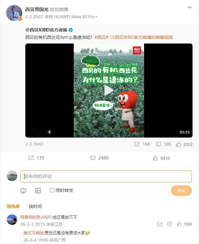 贾国龙微博解禁后,首条动态竟然是转发西贝官方视频《西贝的有机西兰花为什么是速冻哒?》,认真科普速冻锁鲜技术、有机种植流程和门店使用标准。 网友却调侃道:“贾总这哪是在解释西兰花,分明是还没原谅大家啊。[捂脸]” 还有网友表示:“看似讲菜,实则意难平。” 这届网友,怎么说呢?有点太会了。[抠鼻]