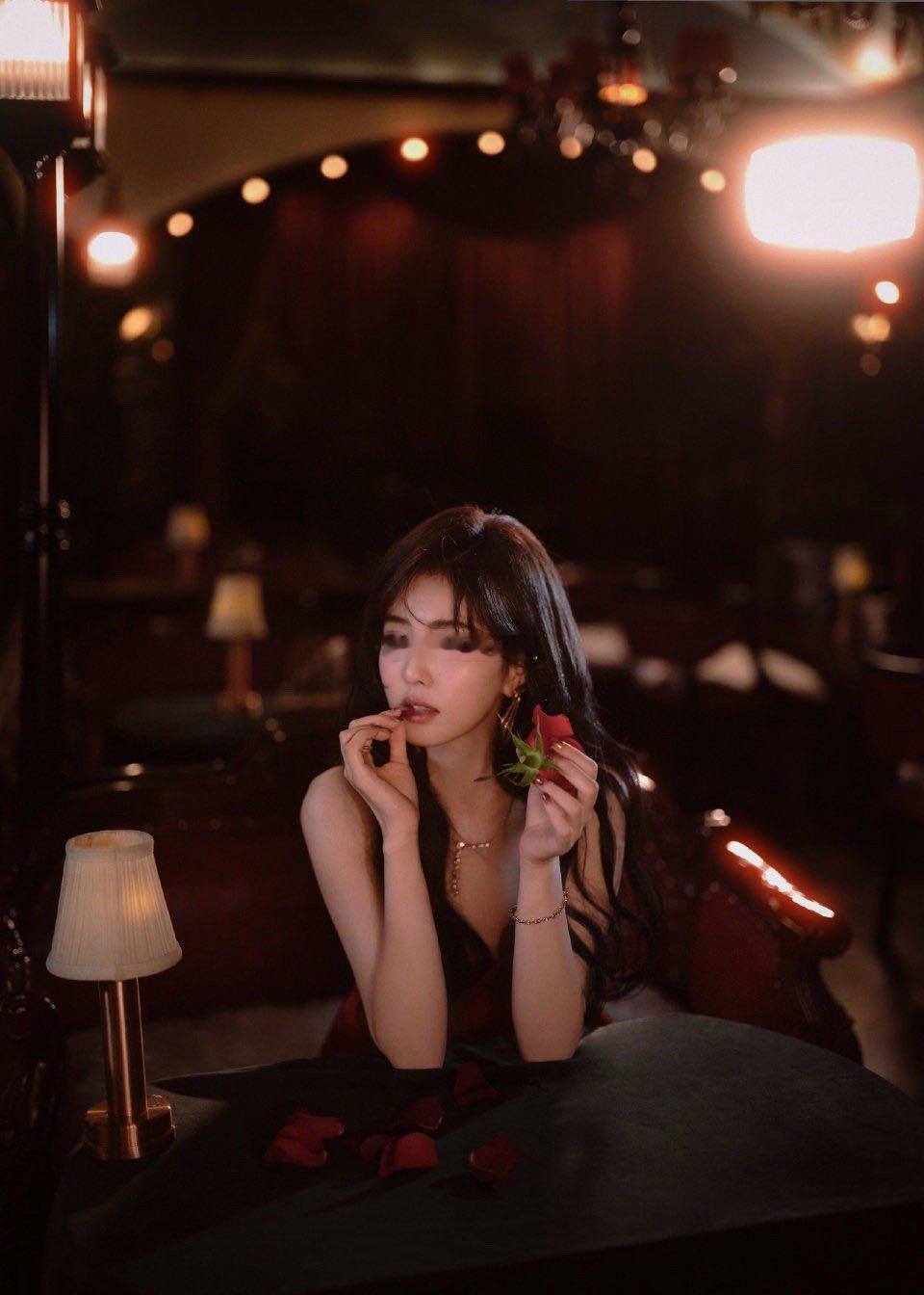 大波浪卷发+红唇,在红丝绒幕布的光影里,美得像从老画报里走出来的明艳美人,冷艳又勾人