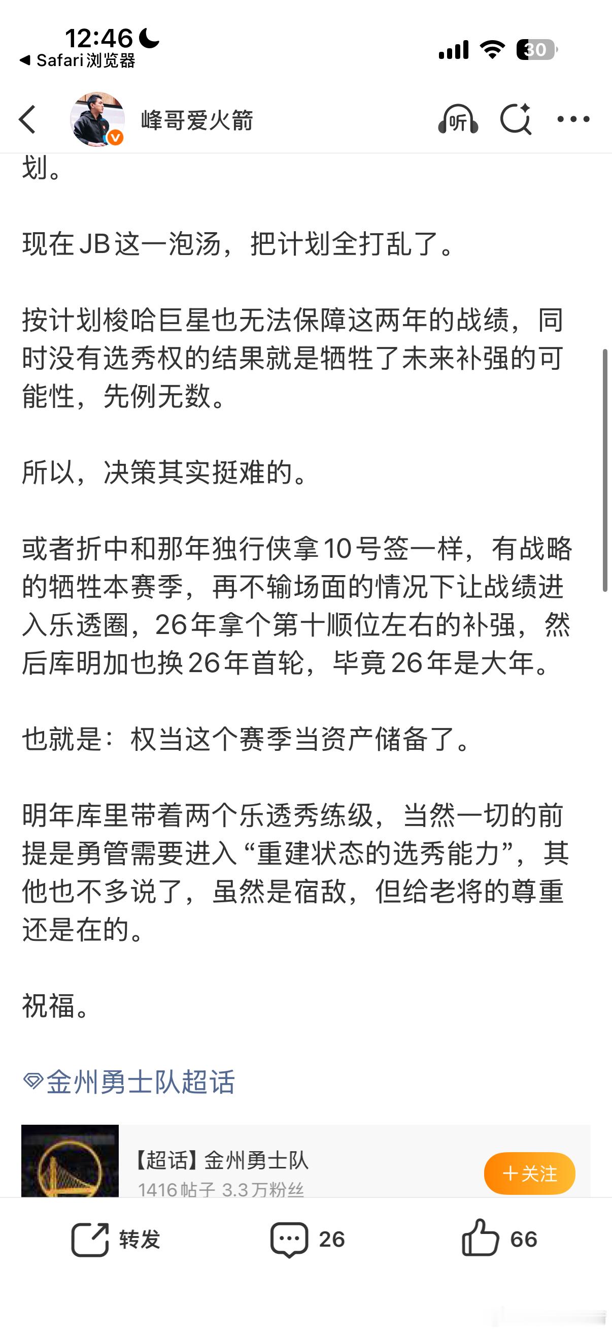 巴特勒的受伤打乱了勇士乃至联盟的计划,铂金是到期合同,勇士应该开始26年之后的重建了。