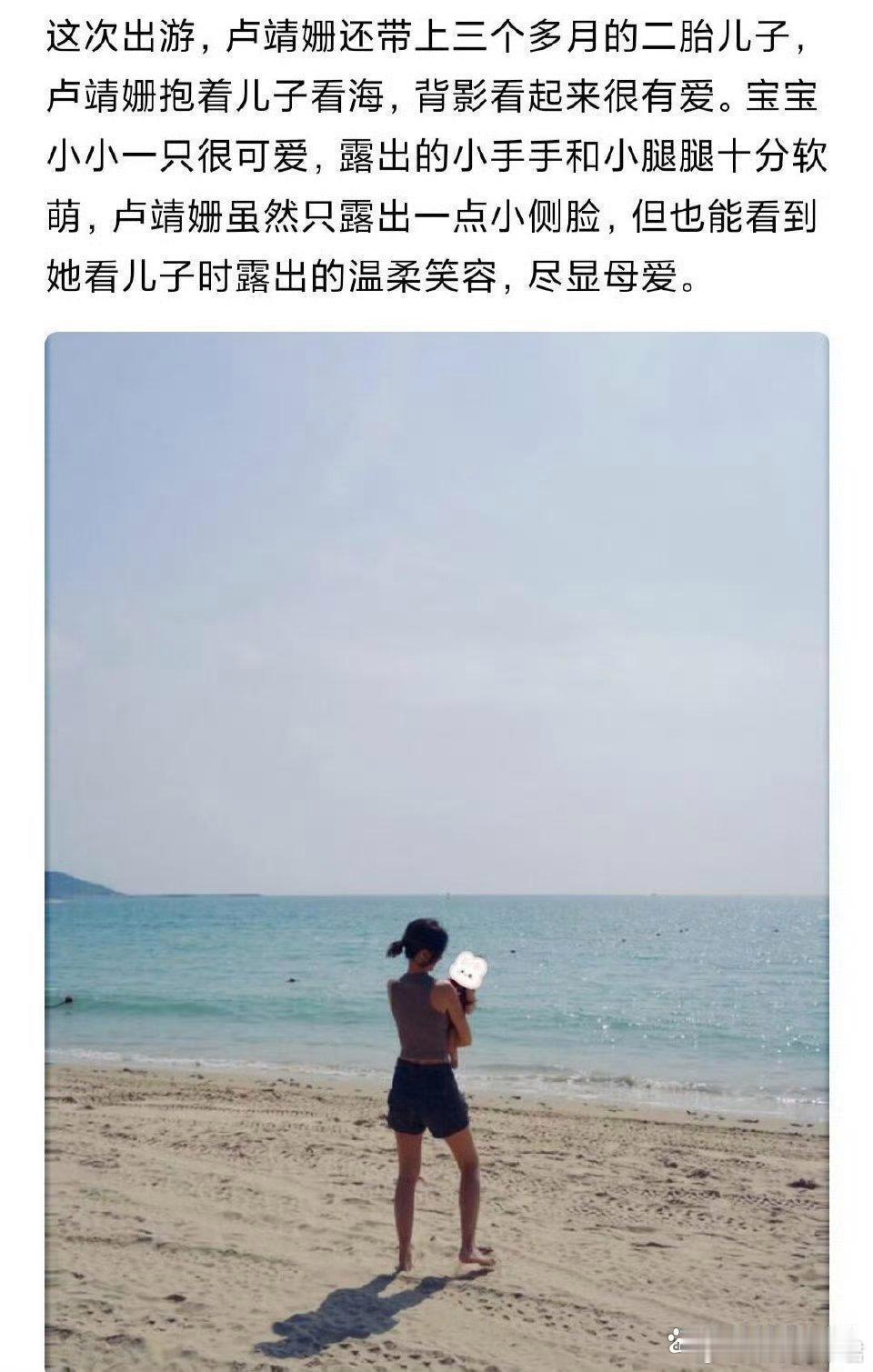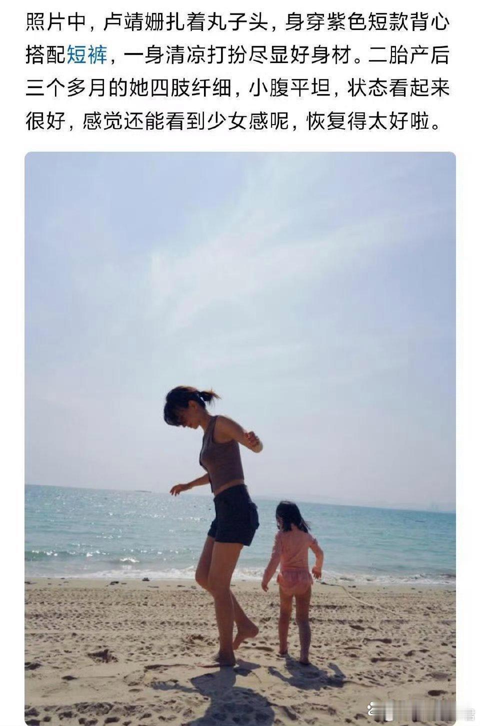 卢靖姗二胎产后3个月状态2月4日,演员卢靖姗首次在社交平台公开晒出与韩庚所育的一双儿女同框照,分享母子三人在海边度假的温馨画面,照片中,产后三个月的卢靖姗四肢纤细、小腹平坦,状态被网友赞“少女感依旧”。