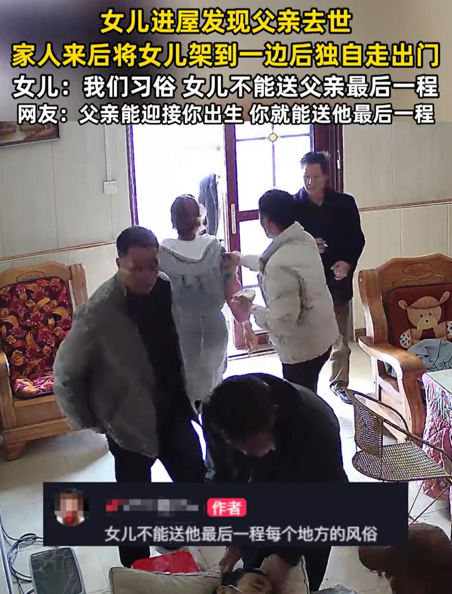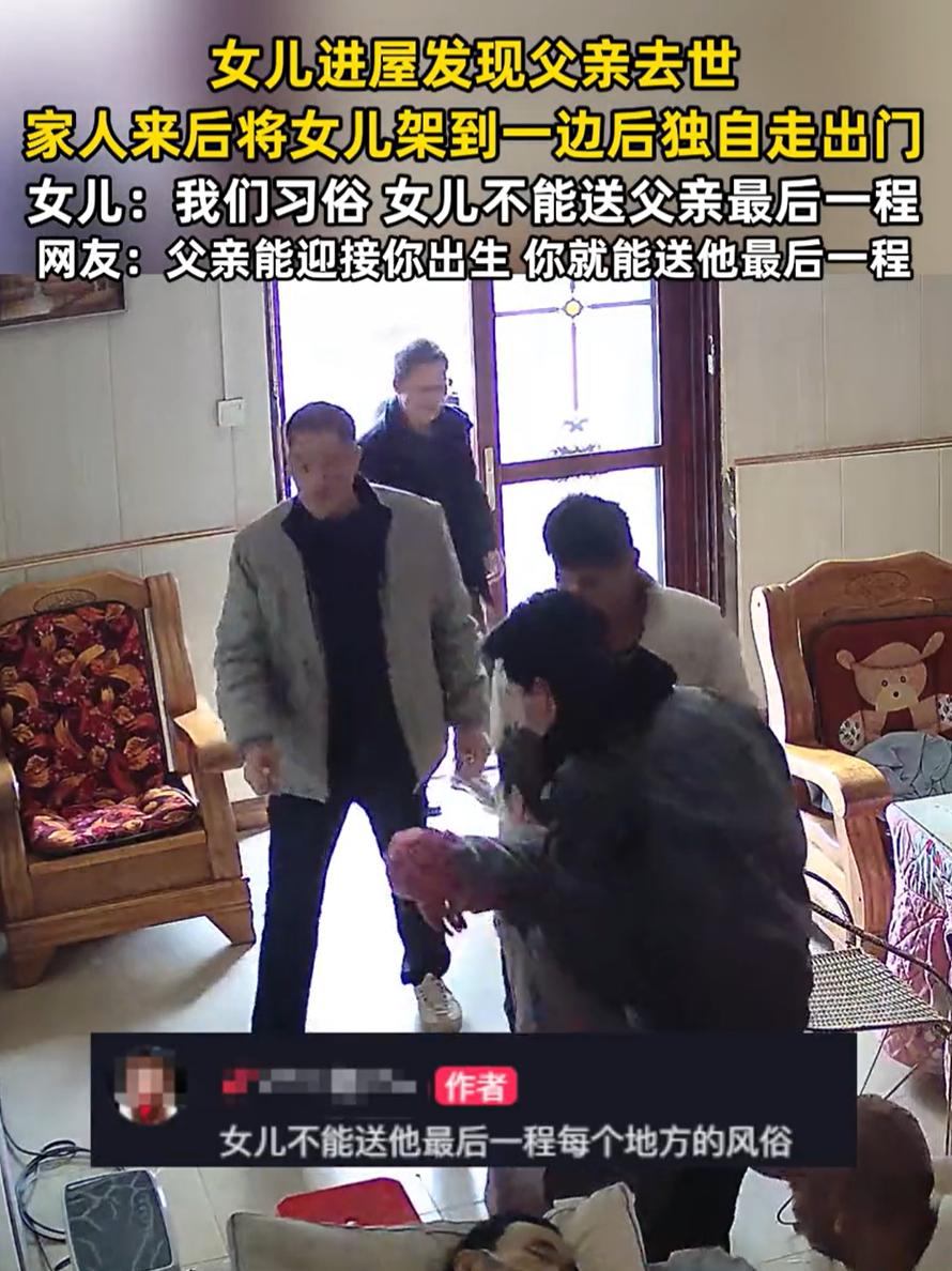 这是啥规矩!广西,一女子回屋里时突然发现躺在床上的父亲去世了,女子当初崩溃大哭,家人听到哭声后都赶了过来,唯独把女儿架出了门外,女儿表示,这是家乡习俗,不能送父亲最后一程,但网友却无法理解 监控显示,当时女儿刚在院子里干完活,身上还带戴着围裙,进屋时就发现父亲躺在床上一动不动,起初他还以为父亲睡着了,但越看越不对劲,上前碰了下父亲,发现他没有反应,当场就崩溃了,坐在地上一边哭一边喊人 很快,家人闻声赶来,屋子里很快站满了人。可接下来的一幕却让她更难受,一位亲戚直接把她从地上扶起来,半拉半劝地架出了房门。她抹着眼泪,默默退到门外,眼看着其他人围在父亲床前,自己却连多待一会儿都不被允许 事后她表示,这是家里的习俗,女儿不能送父亲最后一程 不过很多网友却表示不能理解 有网友说:这是啥规矩呀!父亲都能迎接你到人间来,为啥不能送他最后一程 其实类似习俗在不少地方都有。有的地方认为女儿出嫁后是“外人”,有的说女性属“阴”,不宜参与送终,有的干脆说不出理由,只说“老祖宗传下来的” 我不反对传统,但传统也该有温度。父亲养育女儿一场,女儿想尽最后的心意,这份心意本身比任何形式都重要 也许改变需要时间。但至少我们可以开始讨论,可以慢慢让那些不再合时宜的规矩软化成一种选择,而非强制。比如愿意守旧的家庭按旧例办,愿意打破的家庭也不被指责。让情感归情感,习俗归习俗,给人多一点选择的空间 毕竟,在生死面前,还有什么比真诚的告别更重要的呢?