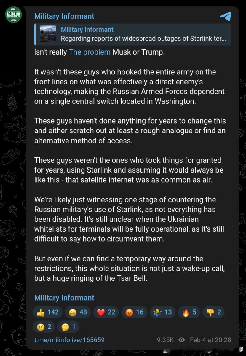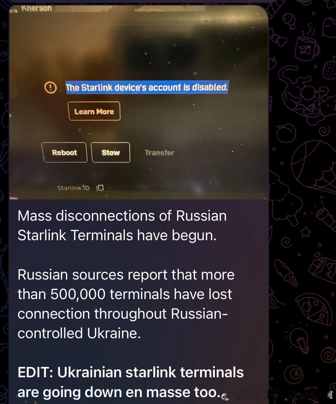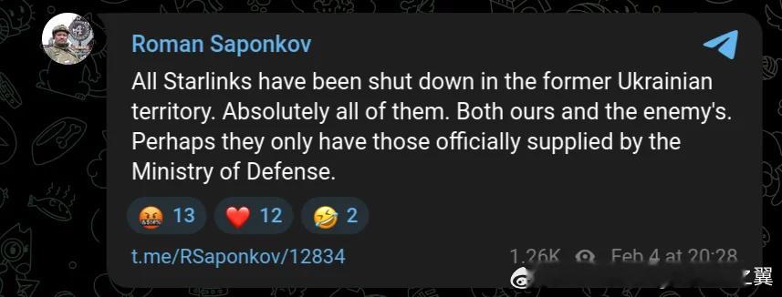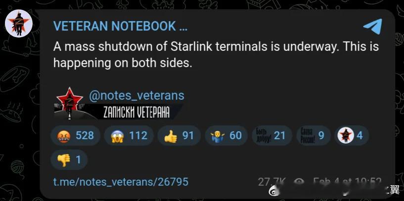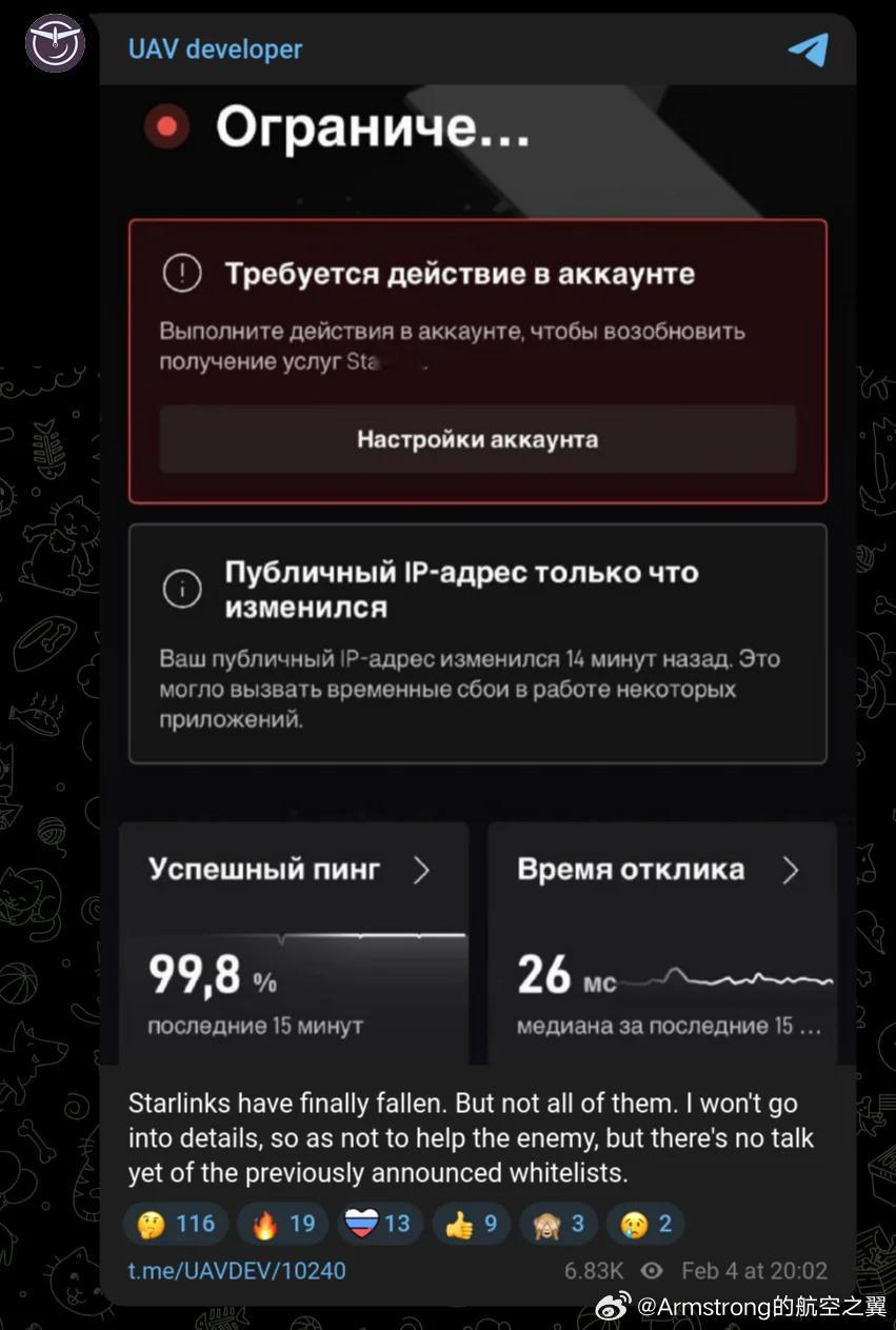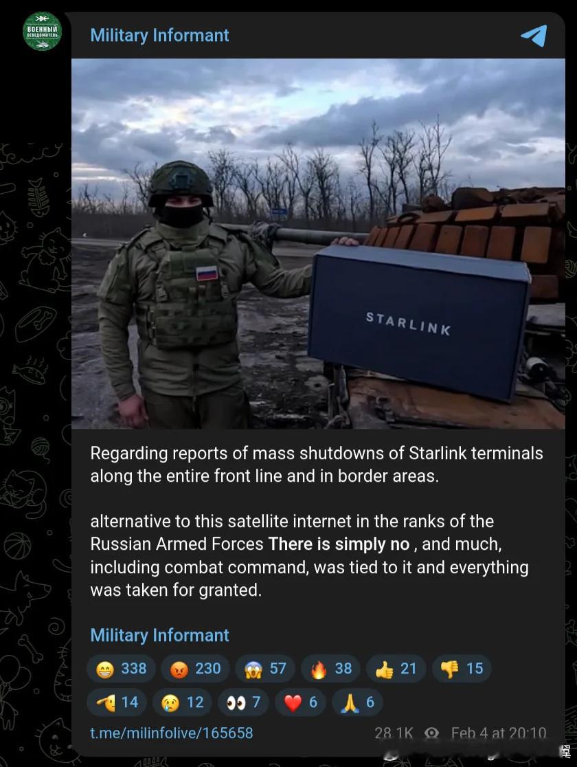 俄罗斯军方Telegram频道报道称,星链系统已开始关闭。除俄罗斯军队失去对星链网络的访问权限外,乌克兰的终端也正在大规模瘫痪。俄乌局势新进展
